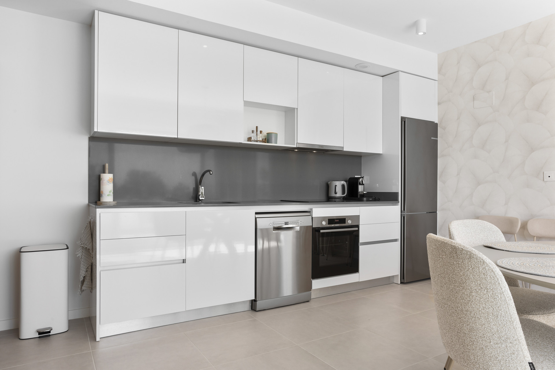 La cuisine américaine, à induction, est équipée avec réfrigérateur, micro-ondes, four, congélateur, lave-vaisselle, vaisselle/couverts, ustensiles/cuisine, cafetière, grille pain, bouilloire et equipement de cuisine.