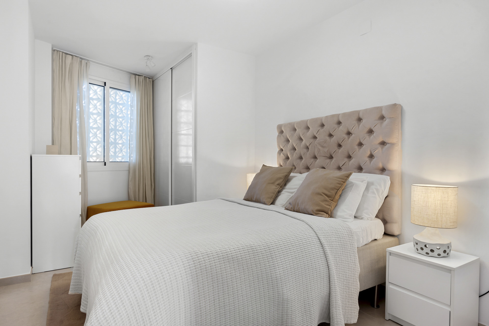 L'appartement comprend 2 chambres et 2 salles de bains. La chambre principale donne sur le balcon et vous permet pratiquement de vous réveiller avec la vue sur la Méditerranée. La deuxième chambre est davantage conçue pour les enfants et comprend un lit superposé avec un lit gigogne et un lit simple supplémentaire.