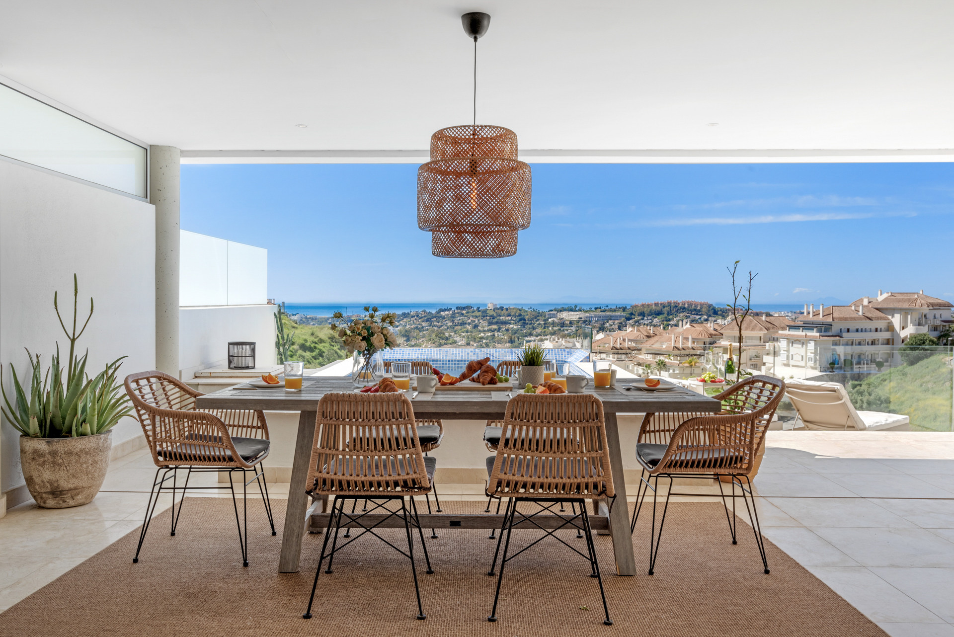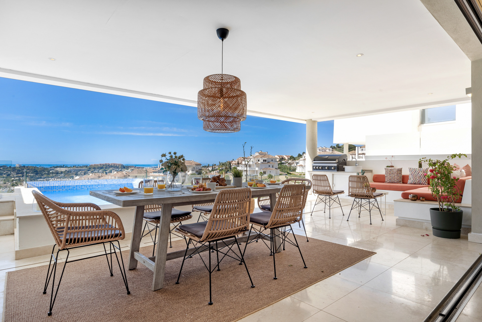 Bienvenue à Casa La Morelia, un refuge joliment conçu de 2 chambres et 2 salles de bains, niché dans les collines de Nueva Andalucía, offrant des vues panoramiques à couper le souffle sur la Méditerranée. Ce lieu de villégiature élégant combine le confort intérieur avec un style de vie extérieur harmonieux, offrant une échappatoire paisible à seulement quelques minutes des plages et de l'énergie de Puerto Banús.