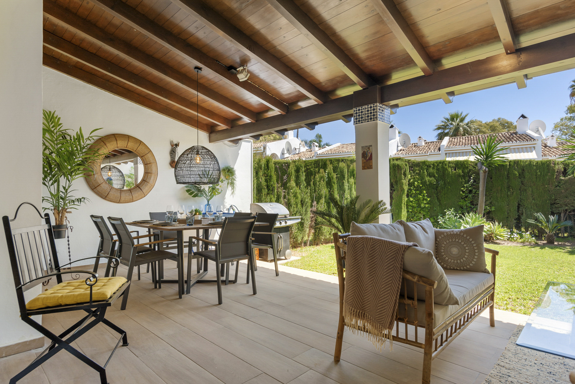Profitez des plaisirs de la vie en plein air avec plusieurs terrasses totalisant un espace de 65m2 et un jardin privé, offrant un espace suffisant pour la détente et le jeu. Le barbecue au gaz sur la terrasse extérieure vous invite à savourer de délicieux repas sous le soleil méditerranéen ou les ciels étoilés.