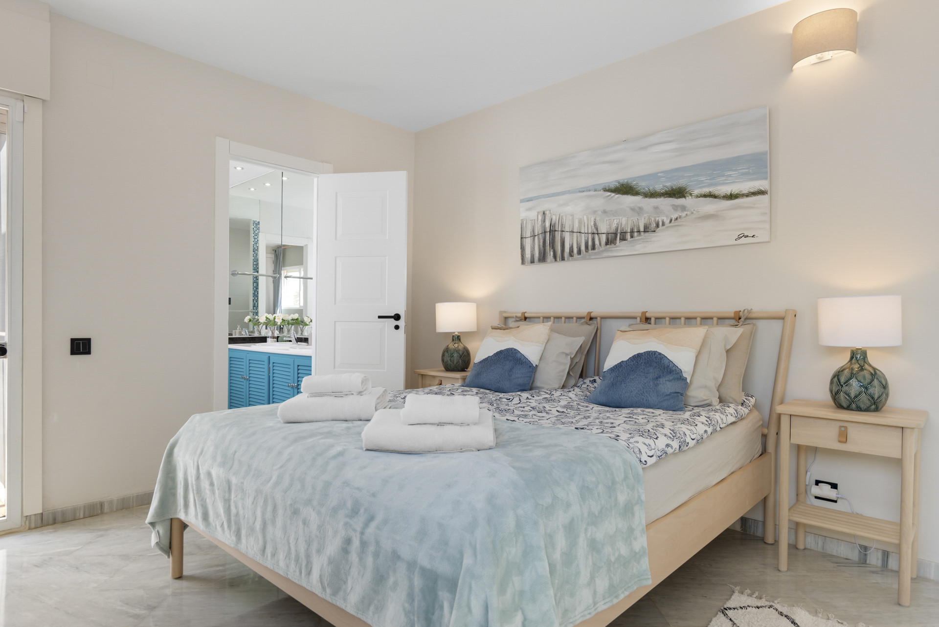 La maison de ville dispose de 3 chambres confortables et de 2 salles de bains modernes, toutes récemment rénovées à un niveau de qualité élevé. L'intérieur combine un design contemporain avec une ambiance lumineuse et côtière, créant un espace accueillant pour se détendre après une journée au soleil. La maison est également équipée d'un système de haut-parleurs Sonos.