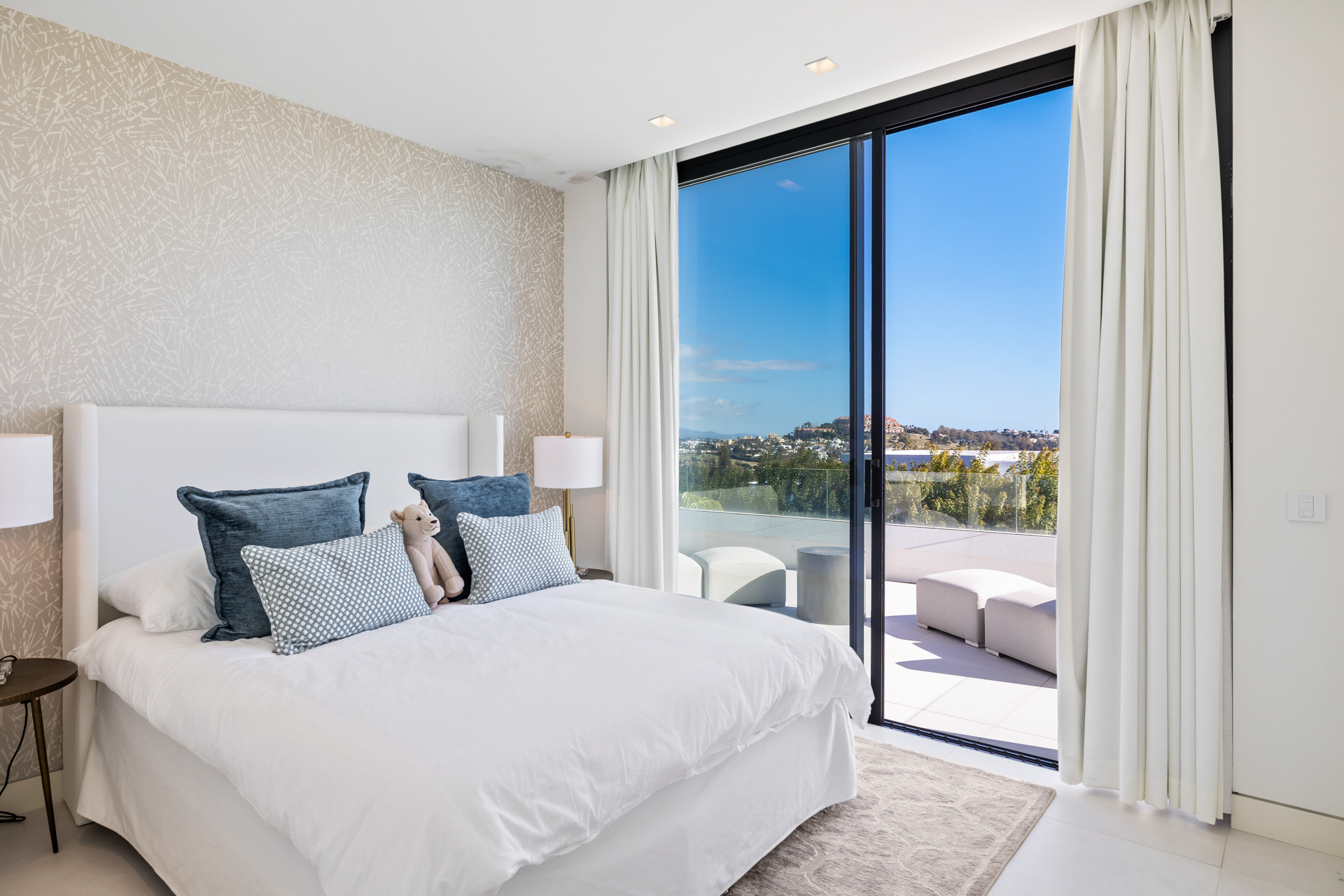 En montant les escaliers, la chambre principale est bien sûr magnifique. Le lit fait face directement à la terrasse privée, et vous avez le plaisir de vous réveiller avec des vues sereines qui s'étendent sur 180 degrés, des montagnes à gauche jusqu'à la mer à droite. La salle de bain attenante dispose également d'une jolie baignoire et d'une douche de pluie, et la chambre est équipée d'un téléviseur intelligent.
