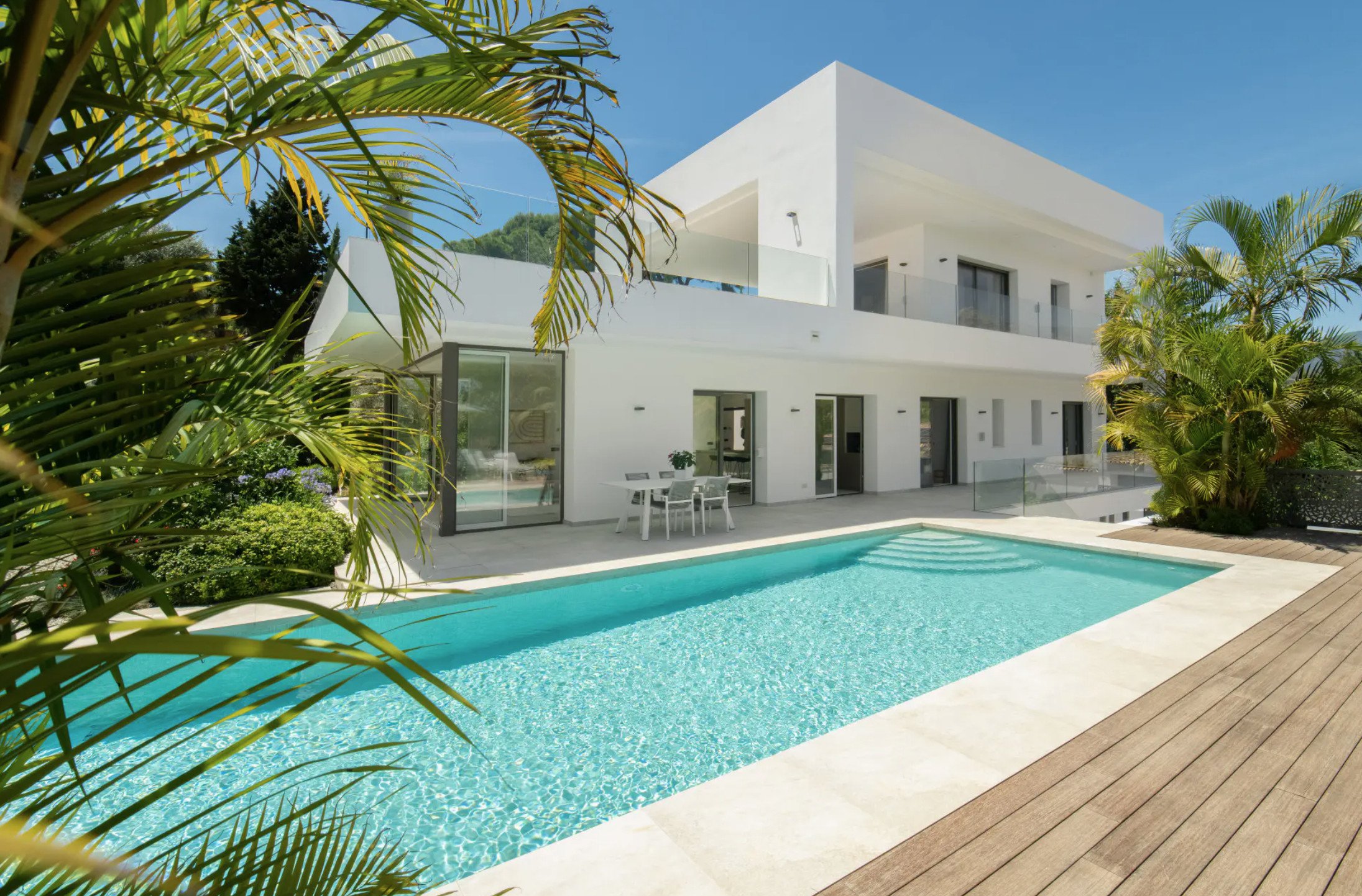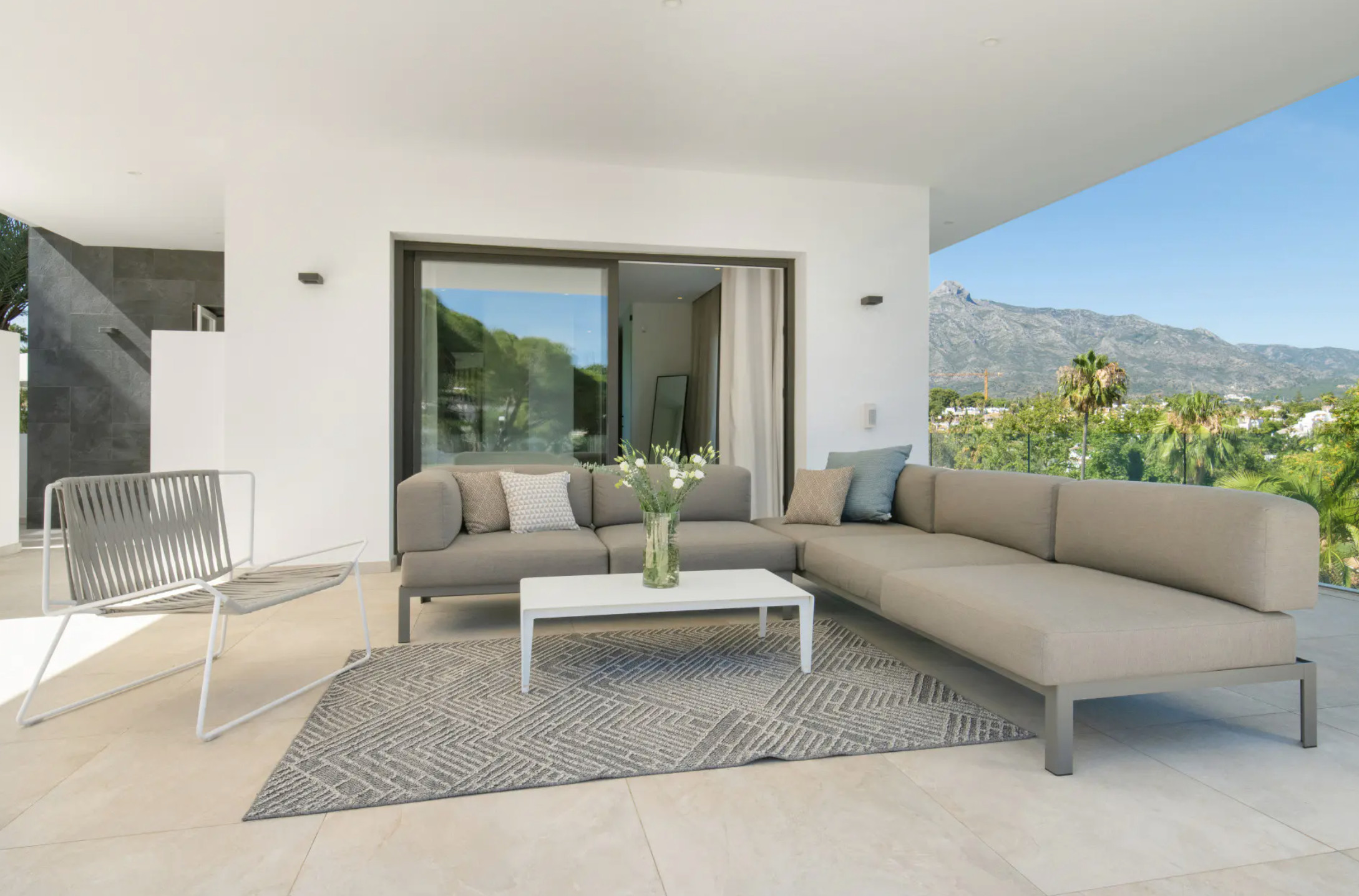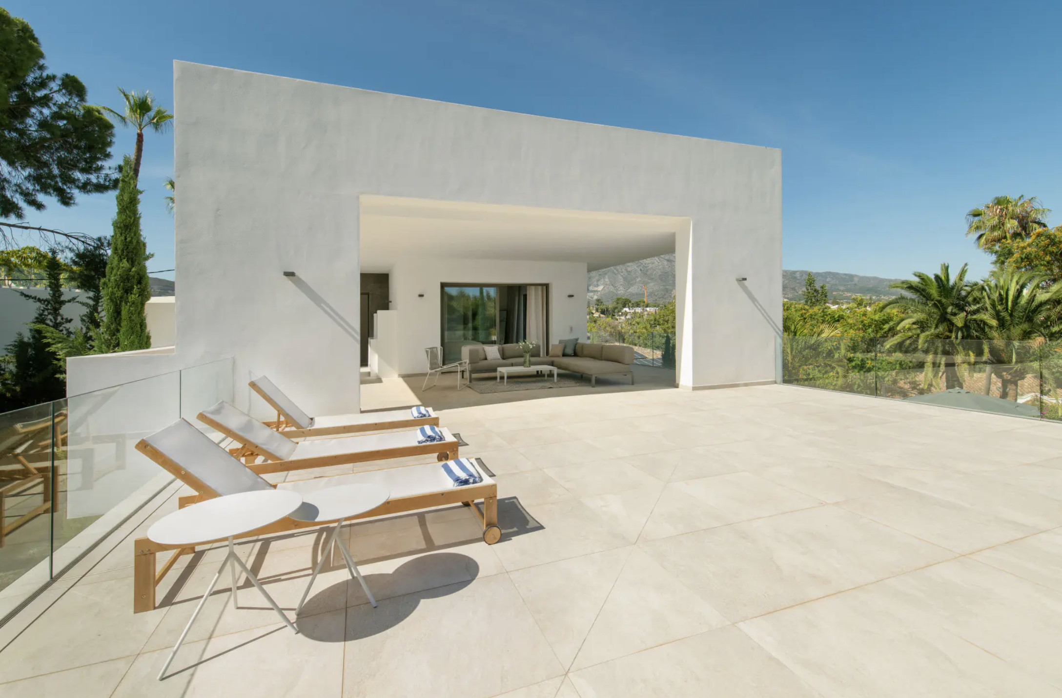 Chacune des cinq chambres spacieuses dispose d'une salle de bain privative, garantissant l'intimité et le confort de chaque invité. L'espace de vie ouvert est lumineux et aéré, menant à une cuisine entièrement équipée et élégante, ainsi qu'un espace de repas raffiné. Les fenêtres du sol au plafond encadrent des vues à couper le souffle et s'ouvrent sur la terrasse spacieuse de la villa et son jardin magnifiquement aménagé. À l'extérieur, une piscine privée spectaculaire occupe le centre des lieux, entourée de chaises longues, d'un coin avec foyer tendance et d'une verdure luxuriante - parfait pour profiter du soleil de Marbella ou passer une soirée sous les étoiles.
