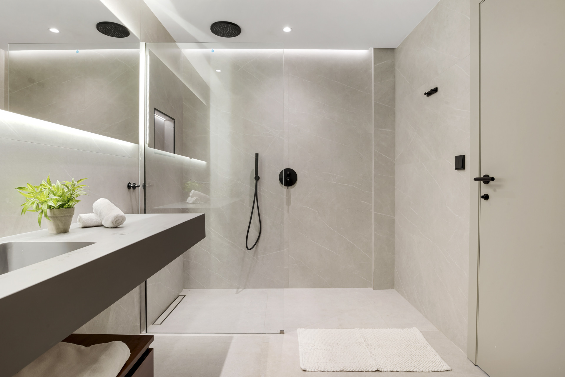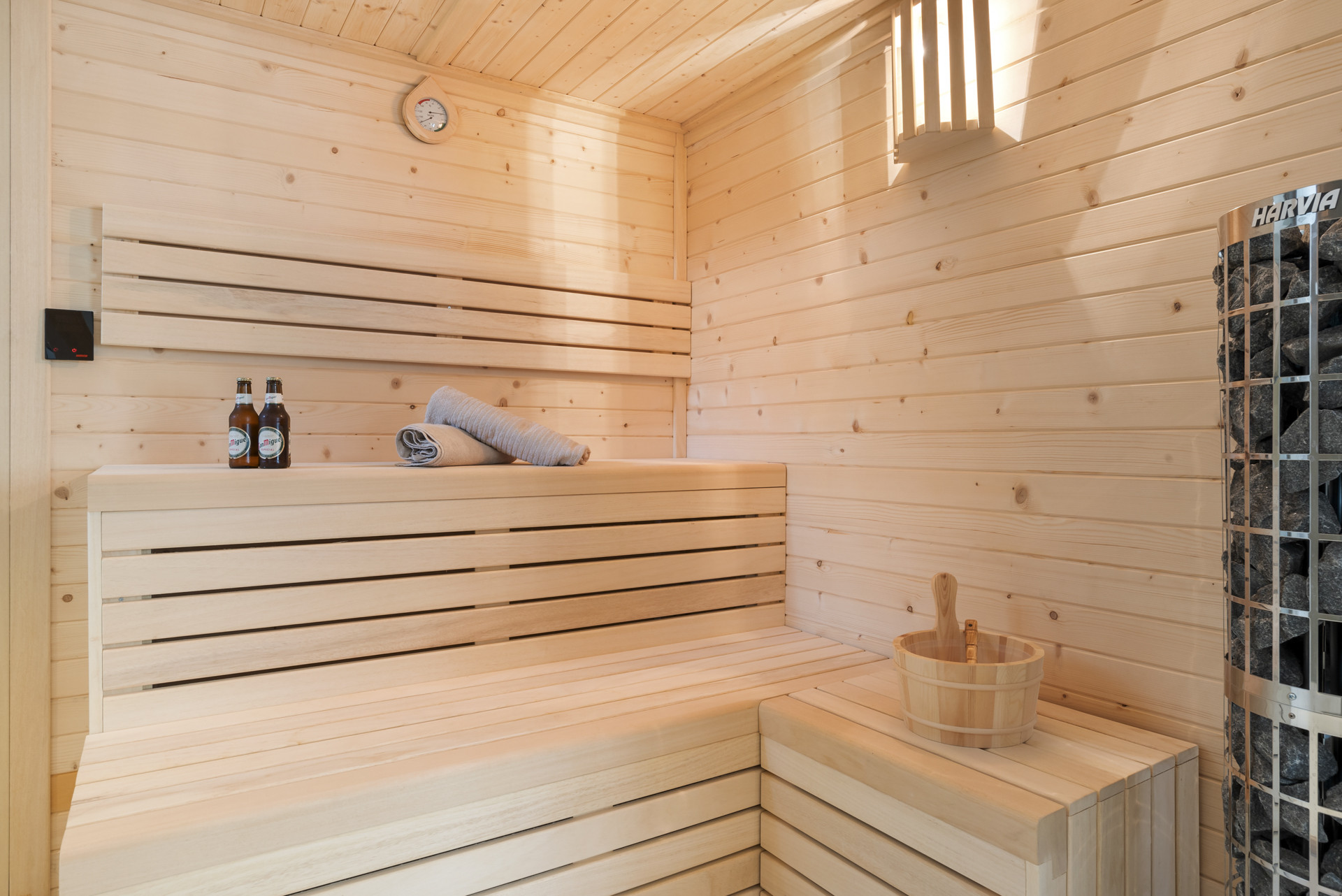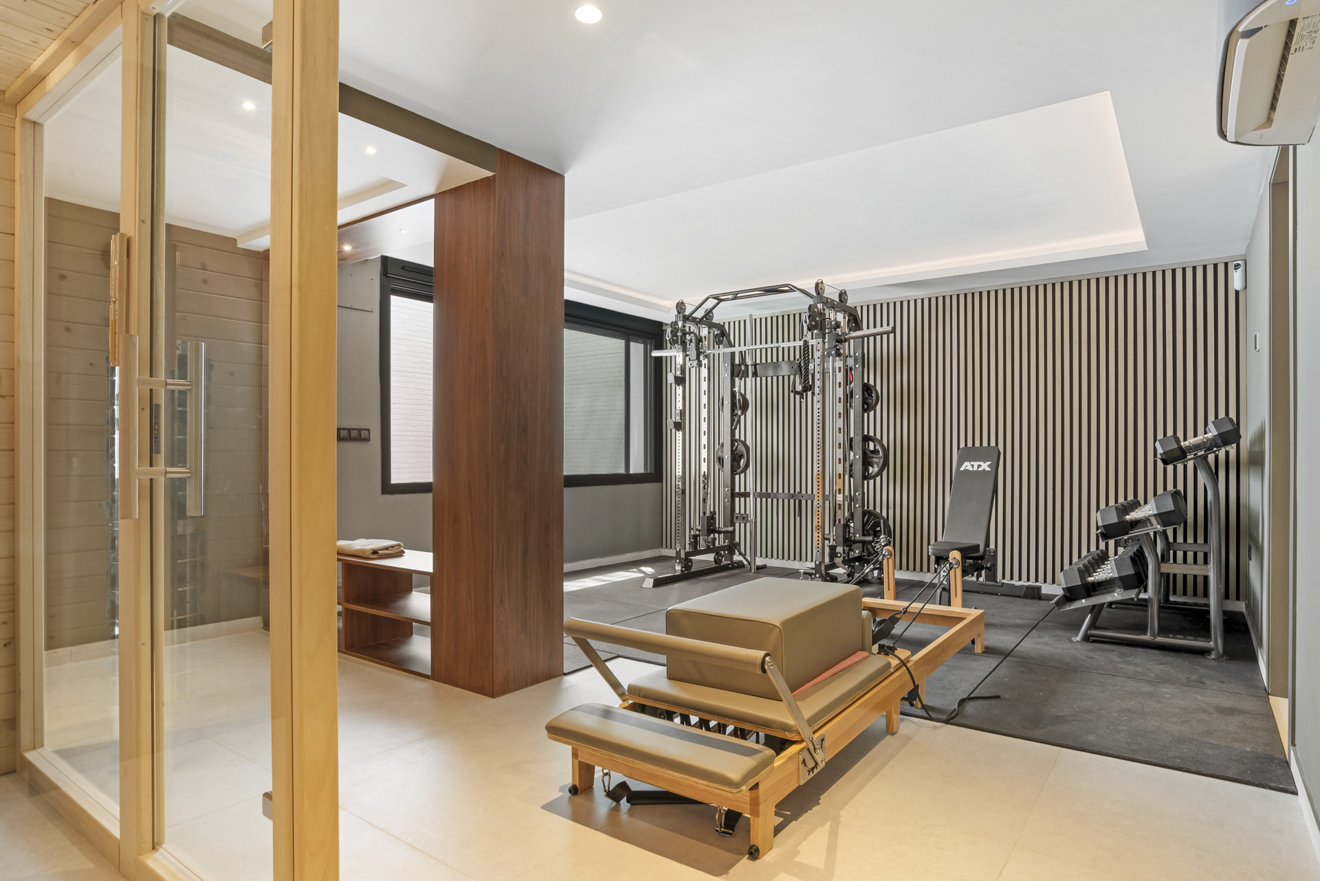 La villa dispose d'une salle de sport entièrement équipée et d'une zone de spa privée avec un sauna à façade vitrée élégant et des douches de pluie doubles luxueuses, créant votre propre retraite de bien-être à la maison. Pour ceux qui travaillent à distance ou qui ont besoin d'un coin tranquille, un poste de travail à l'étage donne sur une terrasse tranquille avec un petit coin cuisine — parfait pour se rafraîchir tout en profitant de la vue sur le jardin verdoyant. La sixième chambre offre une utilisation flexible : elle est équipée d'un canapé-lit de haute qualité qui comprend un matelas complet et approprié, le rendant aussi confortable qu'un lit standard. Avec une smart TV et un design ludique, il est idéal comme salon TV pour enfants ou comme chambre d'amis confortable.