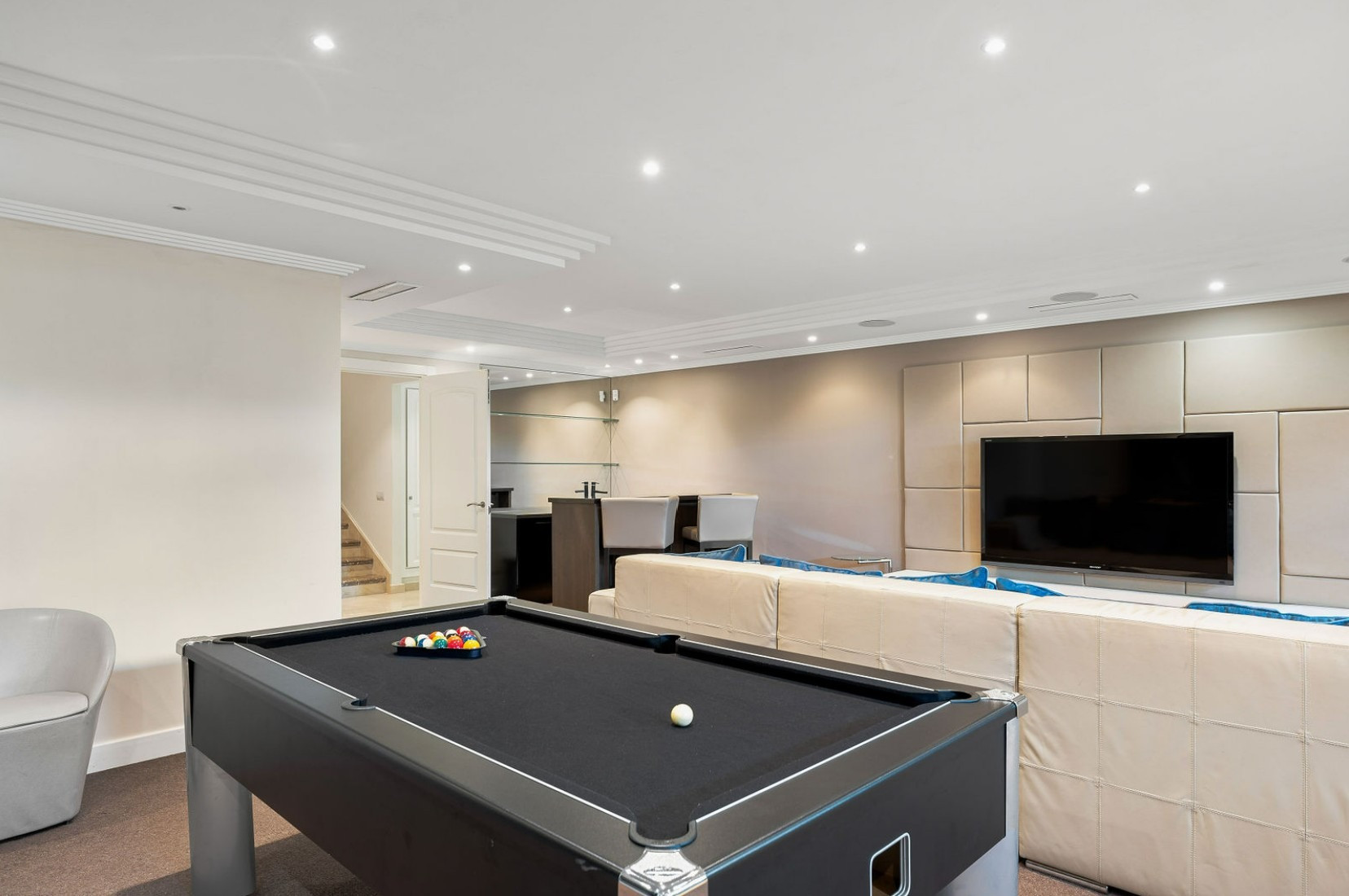 Les espaces de vie principaux sont lumineux et aérés, reliant harmonieusement le salon élégant, l'espace repas et la cuisine moderne entièrement équipée. La villa dispose de quatre téléviseurs stratégiquement placés, dont un grand écran dans la salle de cinéma, un autre dans la salle à manger, et deux téléviseurs supplémentaires dans les chambres d'invités, garantissant que le divertissement est toujours à portée de main.