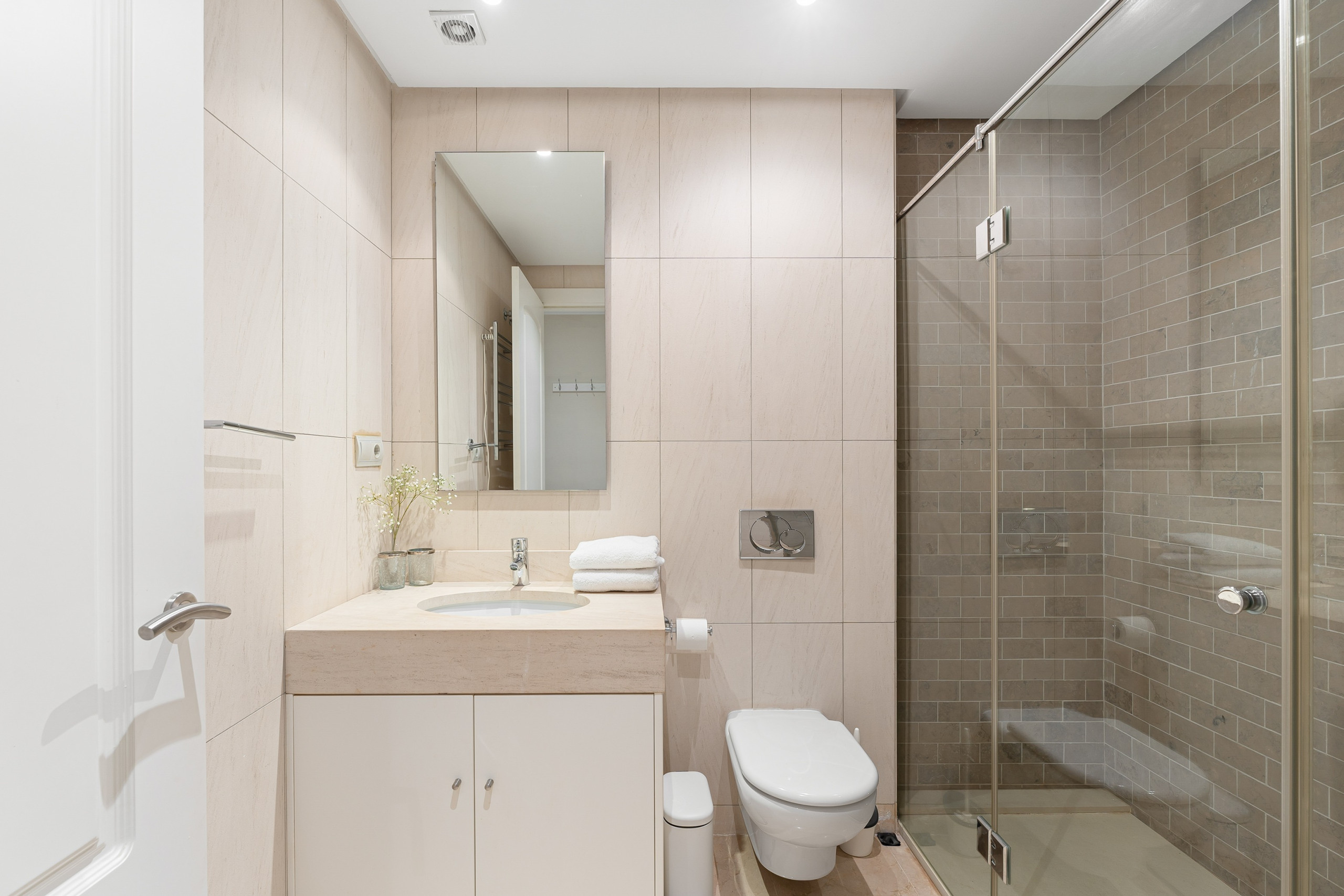 À l'intérieur, Villa Serenis impressionne par sa disposition réfléchie et son luxe subtil. Chaque chambre est équipée de matelas en mousse à mémoire de forme de première qualité, d'une variété de types d'oreillers—allant des oreillers en mousse à mémoire de forme aux alternatives plus douces—et de draps élégants et confortables pour une nuit de sommeil reposante. Les salles de bains de la maison présentent des équipements haut de gamme, notamment des douches walk-in modernes, des carrelages élégants et des finitions contemporaines épurées qui créent une atmosphère de spa. Des toilettes pour invités séparées ajoutent un confort supplémentaire pour l'usage quotidien ou lors de réceptions.