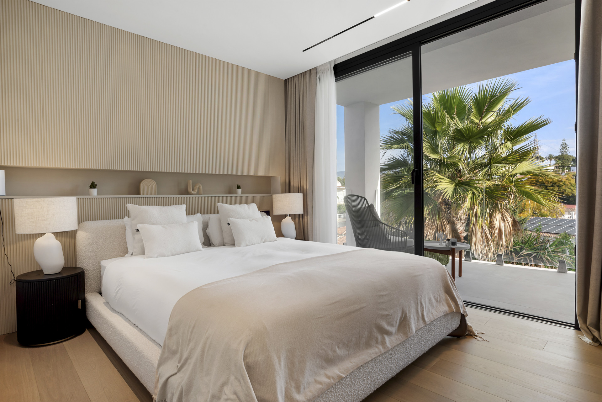 Chacune des cinq chambres spacieuses dispose d'une salle de bain privative, garantissant l'intimité et le confort de chaque invité. L'espace de vie ouvert est lumineux et aéré, menant à une cuisine entièrement équipée et élégante, ainsi qu'un espace de repas raffiné. Les fenêtres du sol au plafond encadrent des vues à couper le souffle et s'ouvrent sur la terrasse spacieuse de la villa et son jardin magnifiquement aménagé. À l'extérieur, une piscine privée spectaculaire occupe le centre des lieux, entourée de chaises longues, d'un coin avec foyer tendance et d'une verdure luxuriante - parfait pour profiter du soleil de Marbella ou passer une soirée sous les étoiles.
