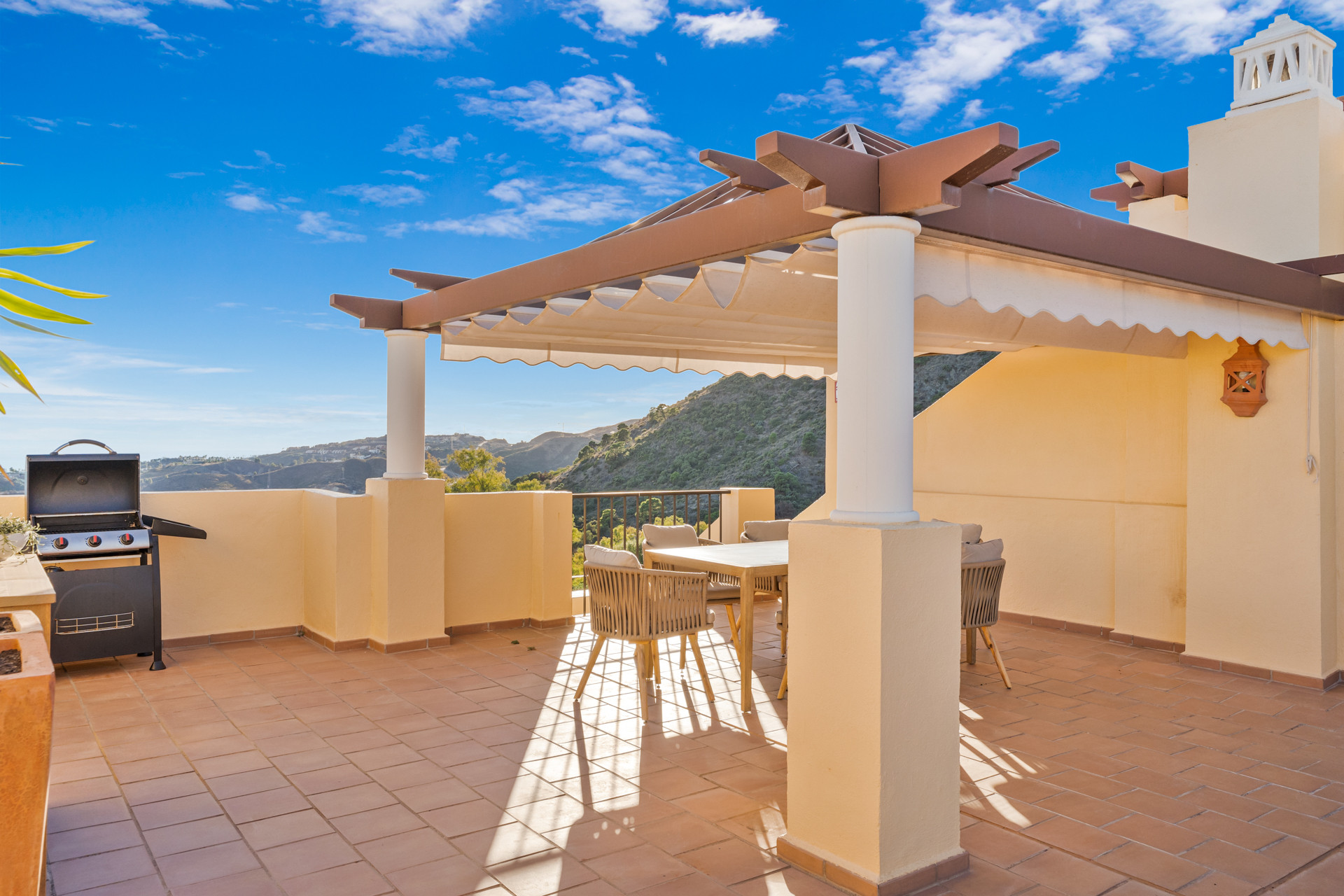 A delightful 2-bedroom duplex apartment within La Finca Los Arqueros. This penthouse apartment benefits from breathtaking views of the sea and mountains and has its very own solarium sun terrace on the rooftop, with various sunbeds allowing you to soak up the sun and enjoy the al-fresco dining with outdoor dining amenities and BBQ.