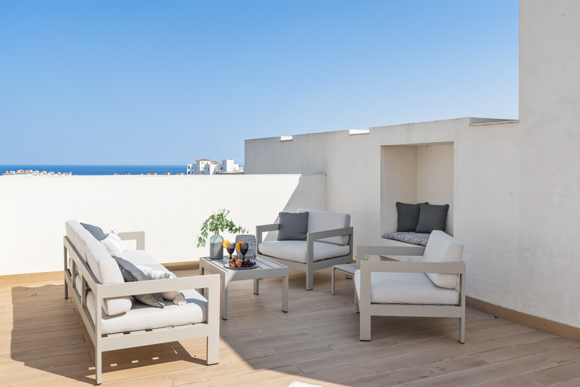 The showpiece of Casa Maja is its rooftop solarium, where panoramic views stretch over the Mediterranean Sea, surrounding hills, and distant mountains. This expansive rooftop space has been thoughtfully designed with a lounge zone, sunbeds, and alfresco dining area—making it an unforgettable spot to soak up the sun by day or entertain under the stars. From here, the tranquility of the sea and the elegance of the coast create a truly elevated living experience.