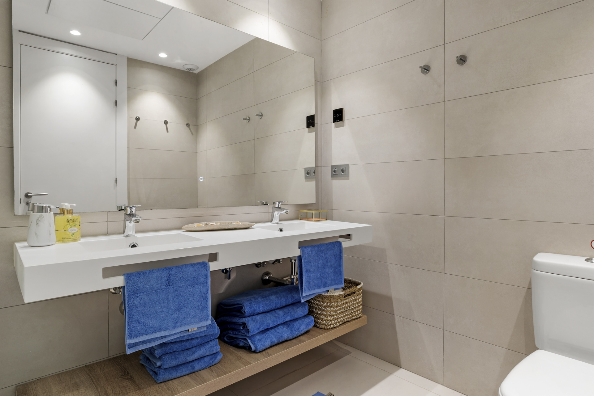 The Master Bedroom has a big double bed (180cm), a small balcony, and an ensuite bathroom with a shower. The second bedroom has a 160cm double bed. There is a second bathroom with a shower/bathtub.