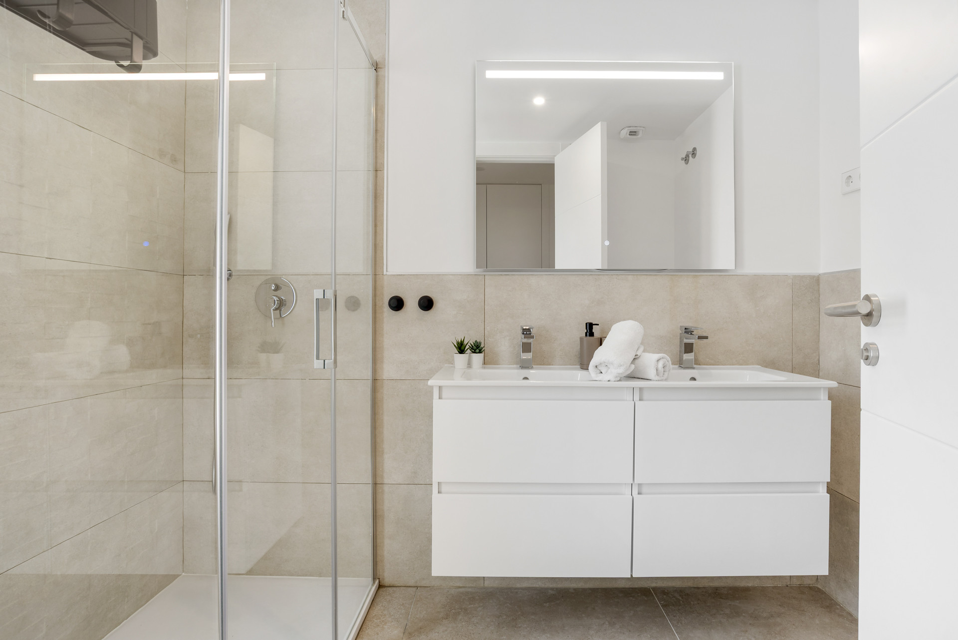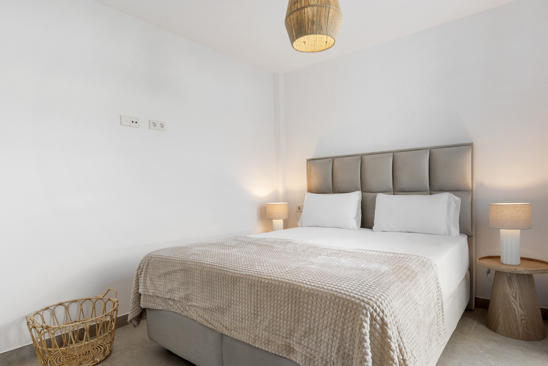 There are 3 double bedrooms, all with King sized beds (180cm). The Master has an ensuite bathroom and a large walk-in closet. The other two bedrooms share a bathroom with a bathtub with overhead shower. All bedrooms have access to the terrace.
