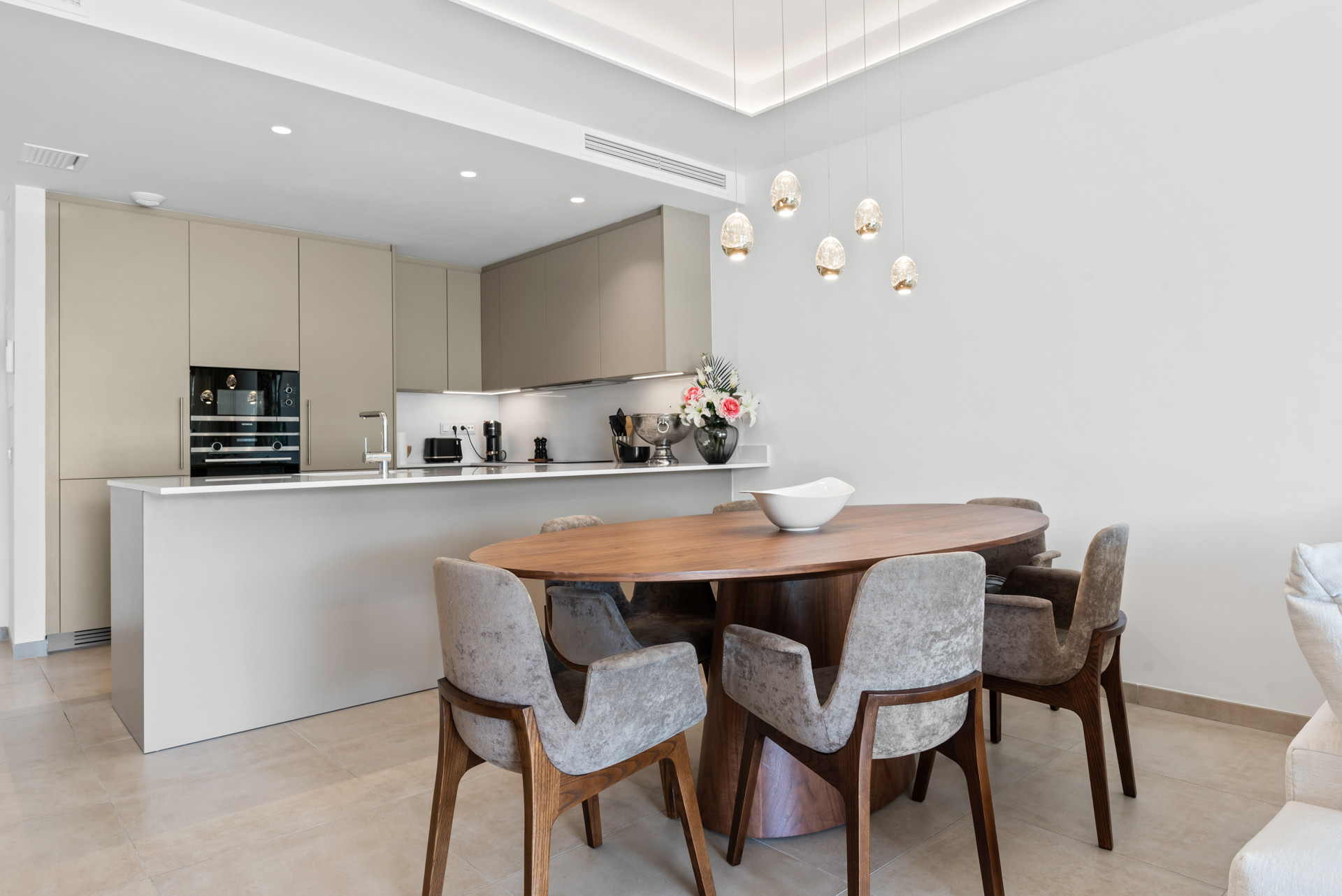 Upon entering, you find the open-plan living area with the dining area and the kitchen which leads into the living area that features a large SMART TV along the wall which seamlessly opens through the floor-to-ceiling glass doors into the stunning terrace.