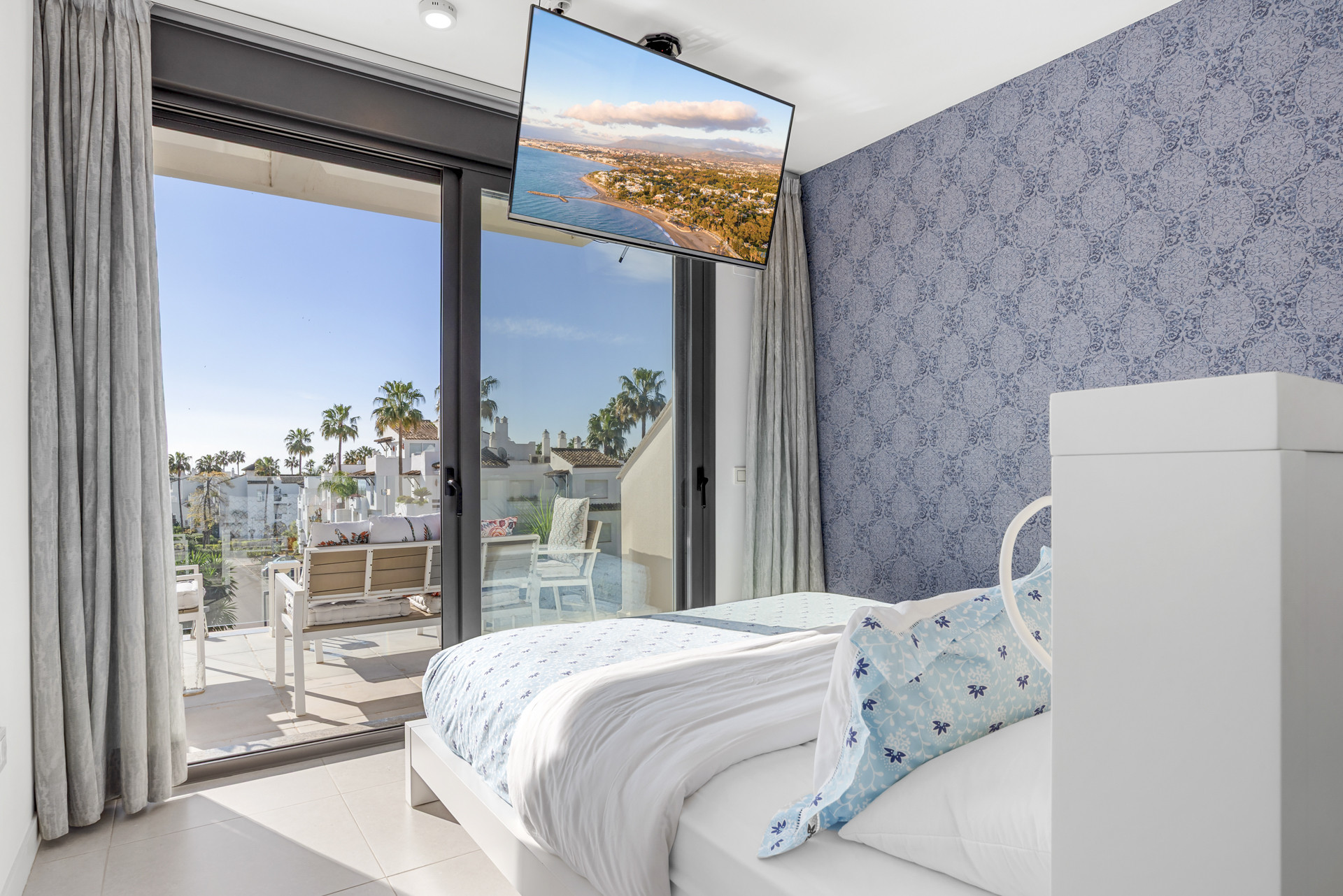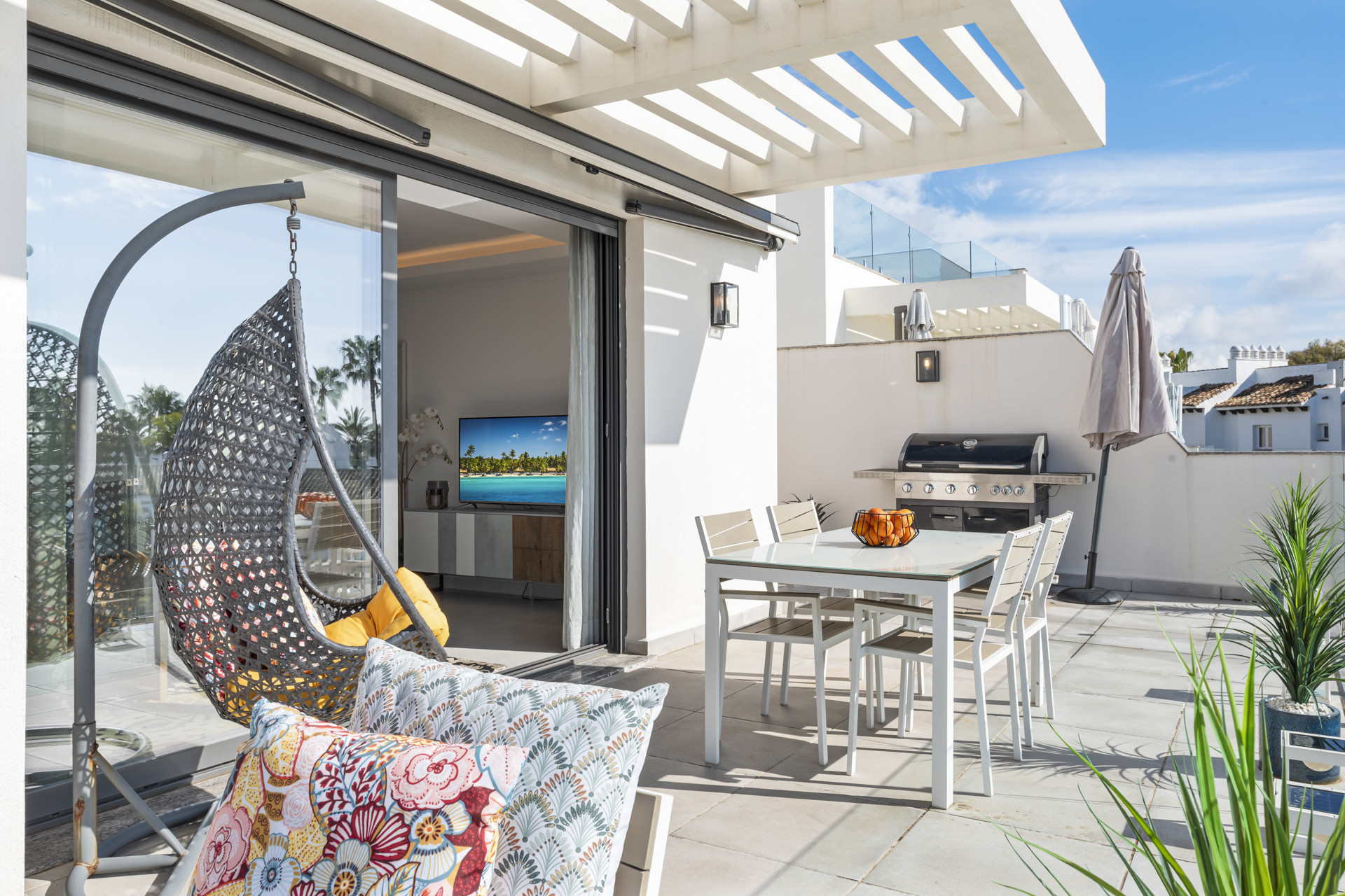 What truly makes this penthouse special is the private rooftop terrace. This is your own personal oasis, designed for making the most of Marbella’s incredible weather. Here you can relax in the jacuzzi while enjoying panoramic views over palm trees and the Mediterranean, soak up the sun on the loungers, or spend the evening cooking on the BBQ and dining under the open sky. It’s the perfect space for both relaxing days and unforgettable evenings.