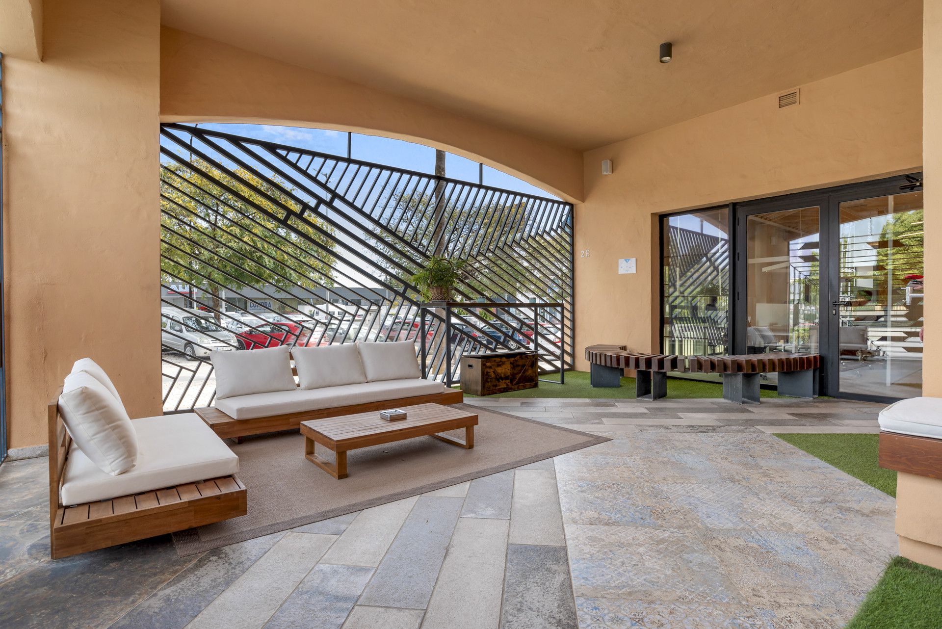 The apartment features two well-sized bedrooms and two bathrooms—one with a bath/shower combo, and the other with both a bath and a proper walk-in shower. The open-plan layout flows into a cozy lounge area that shares its entrance with a professional shared office space, making the front lounge area a unique social hub for residents and co-workers alike. The interiors are filled with natural light and neutral tones, providing a clean and relaxing atmosphere.