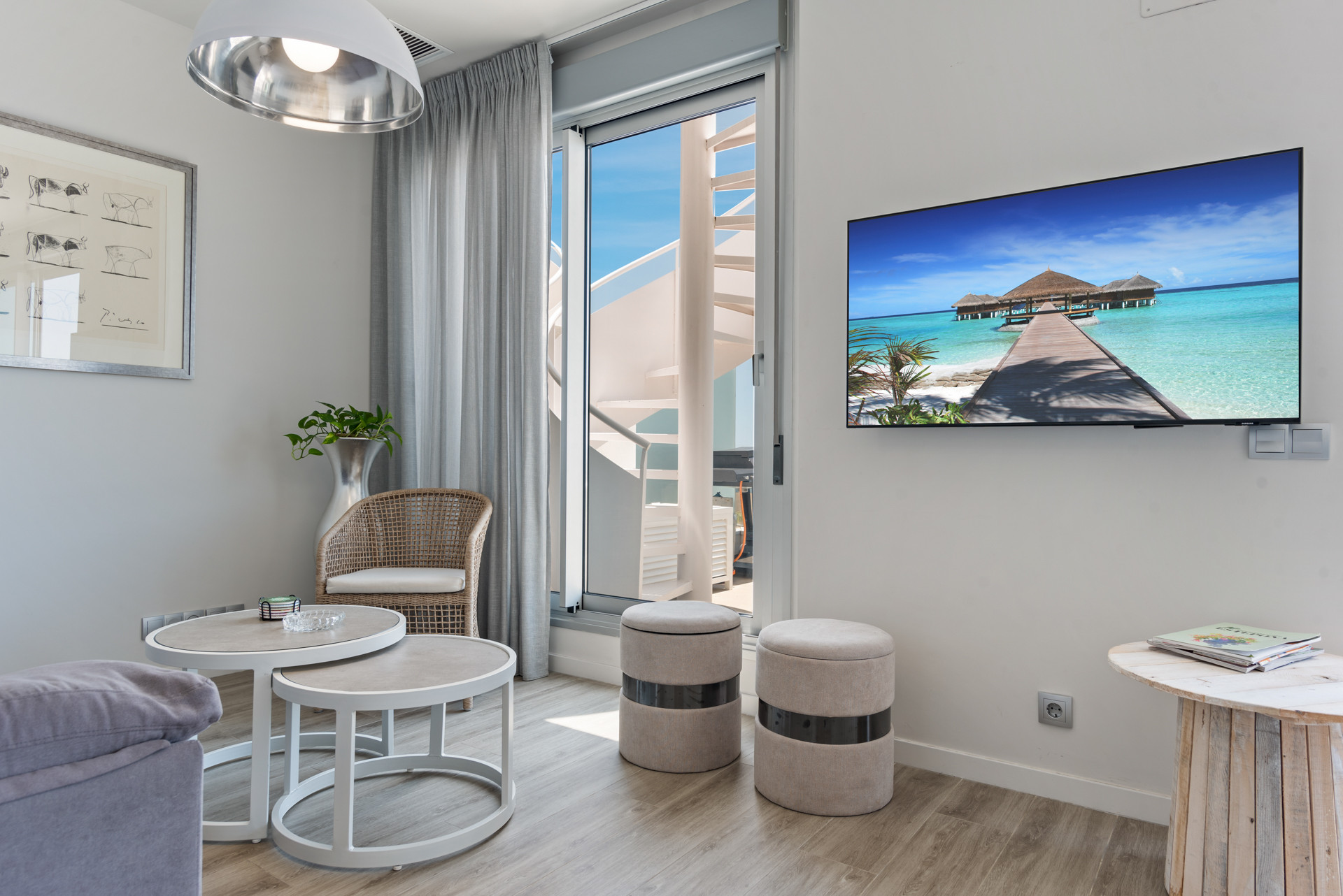 The terrace is a lovely space with contemporary pallet furniture, perfect to enjoy the views with your sundowners. From here we can also access the rooftop terrace stocked with sun loungers and a 4 person jacuzzi. Perfect to end the day, watching the sun set over the Mediterranean Sea in the most relaxing way possible.