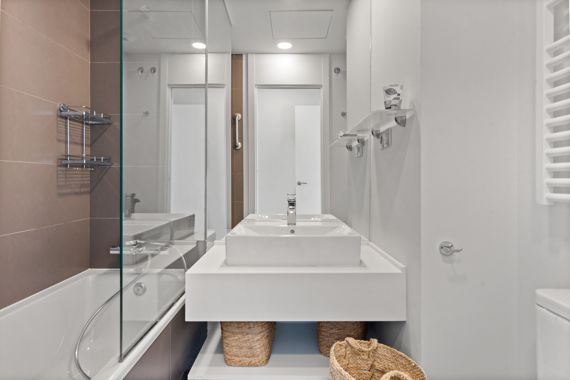 The Master Bedroom has a big double bed (180cm), a small balcony, and an ensuite bathroom with a shower. The second bedroom has a 160cm double bed. There is a second bathroom with a shower/bathtub.