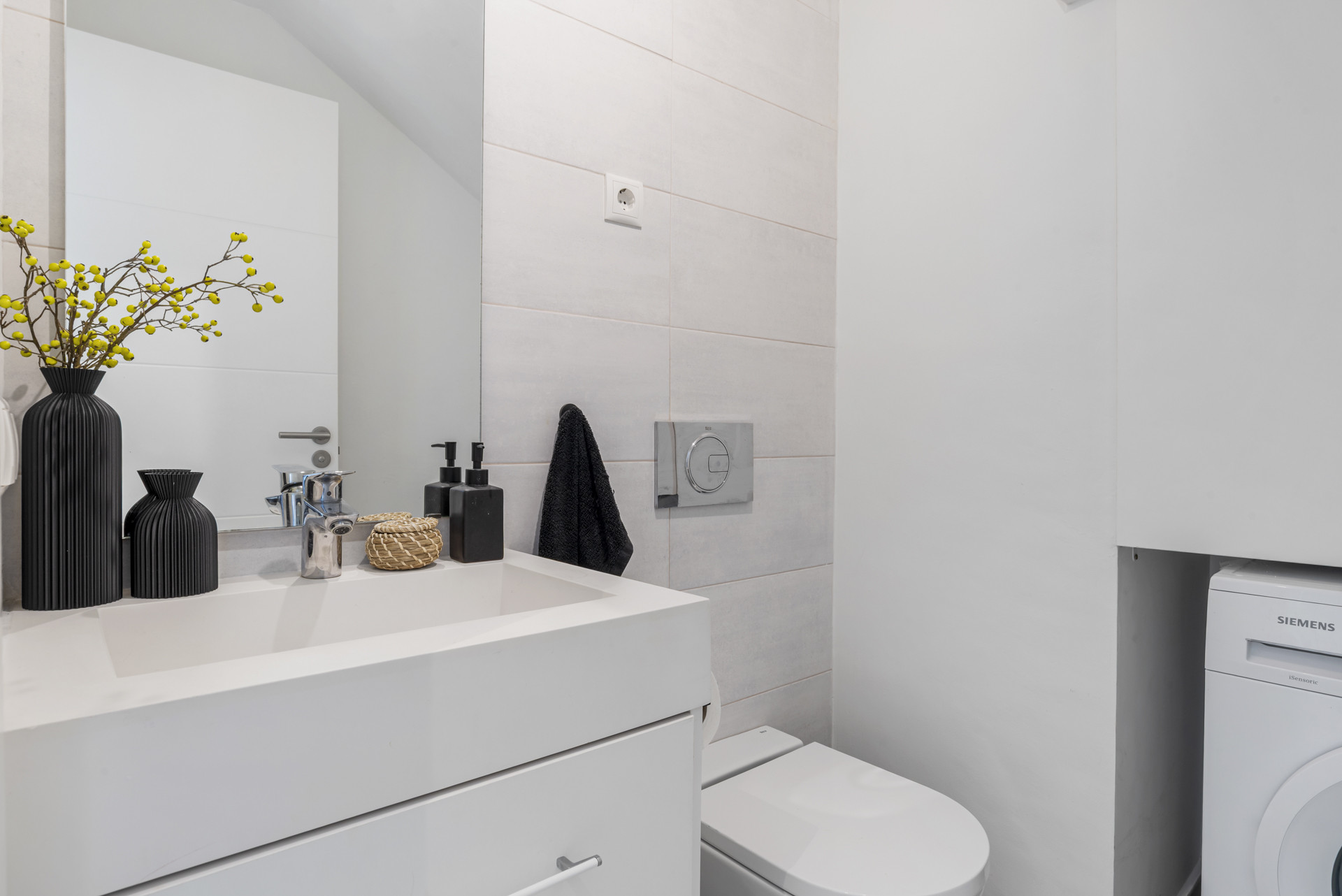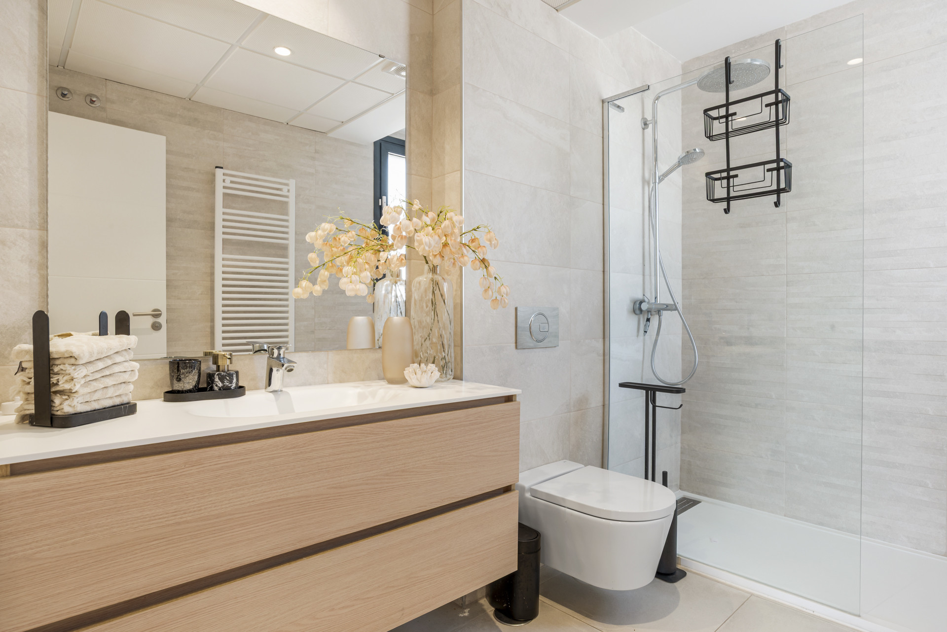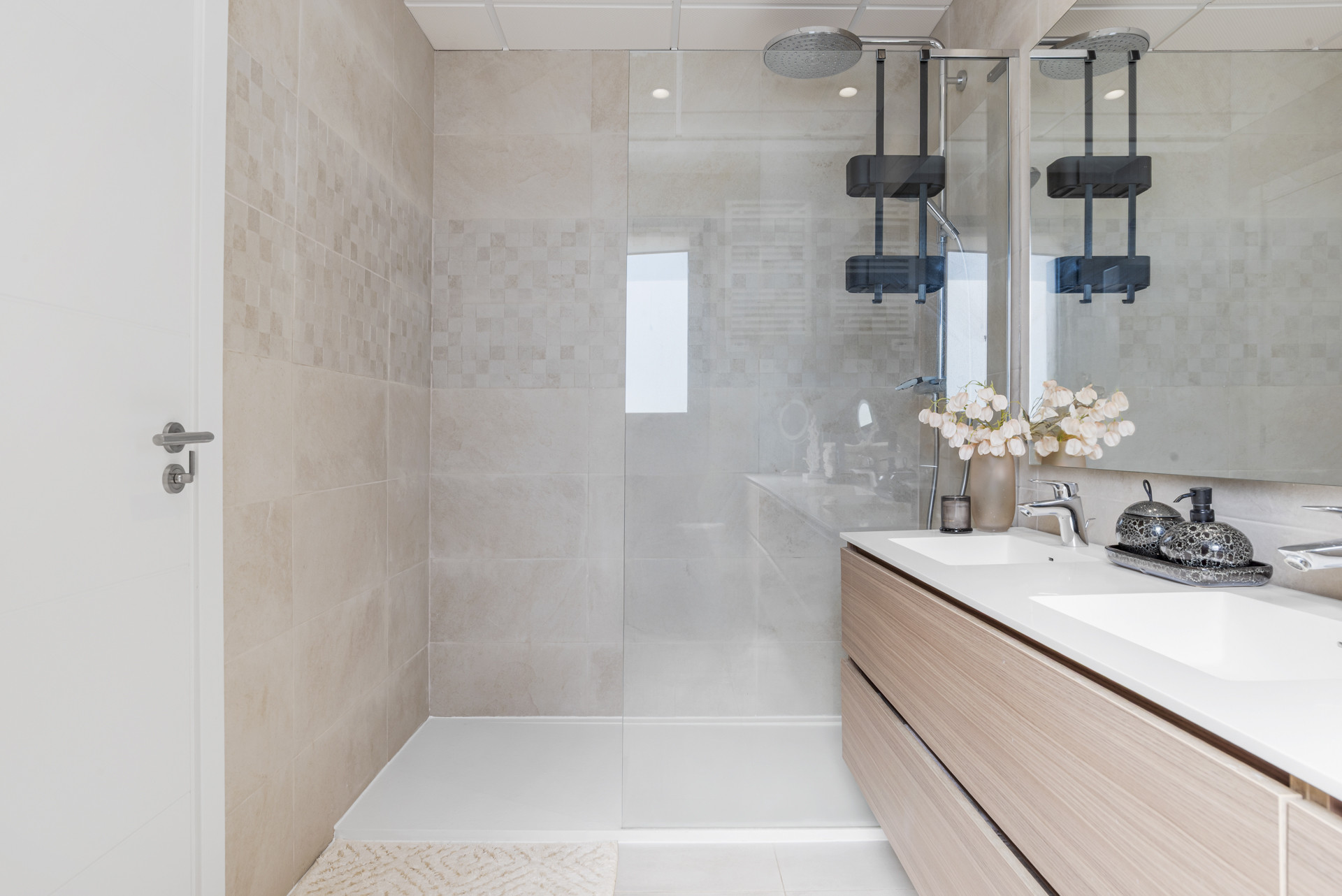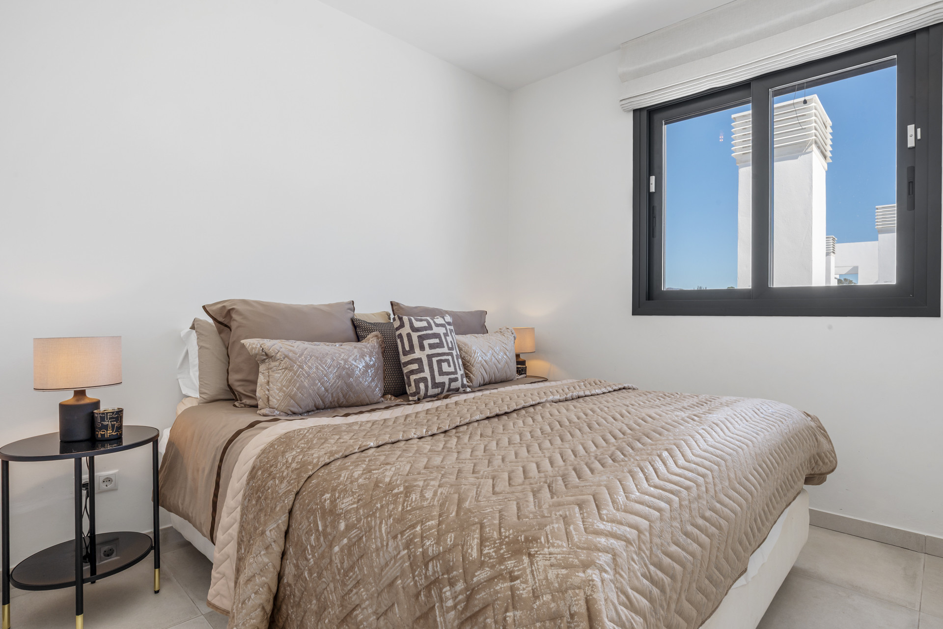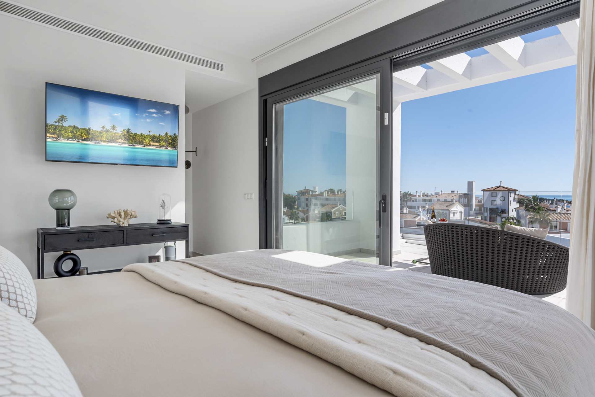 There are 3 double bedrooms, all with King sized beds (180cm). The Master has an ensuite bathroom and a large walk-in closet. The other two bedrooms share a bathroom with a bathtub with overhead shower. All bedrooms have access to the terrace.