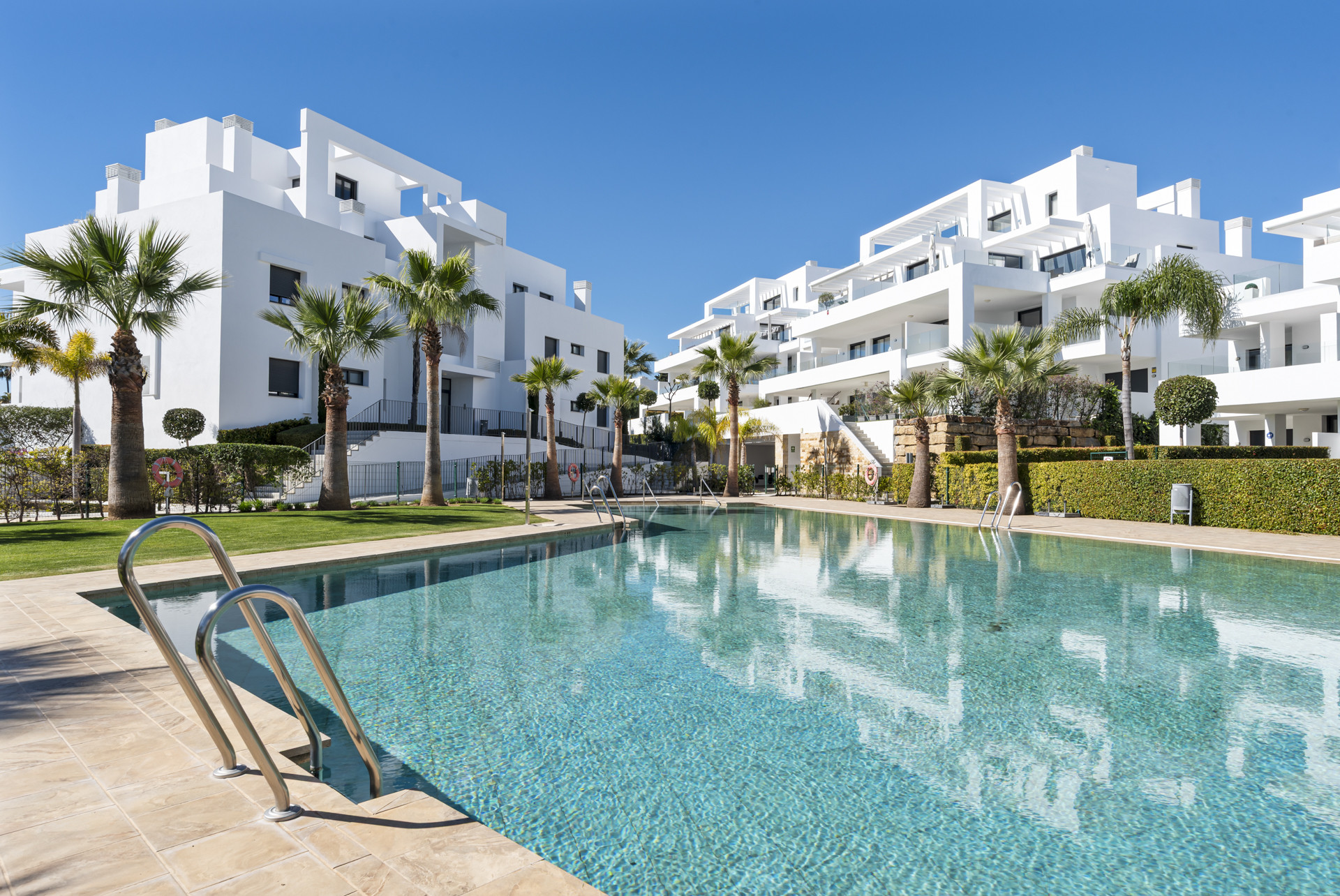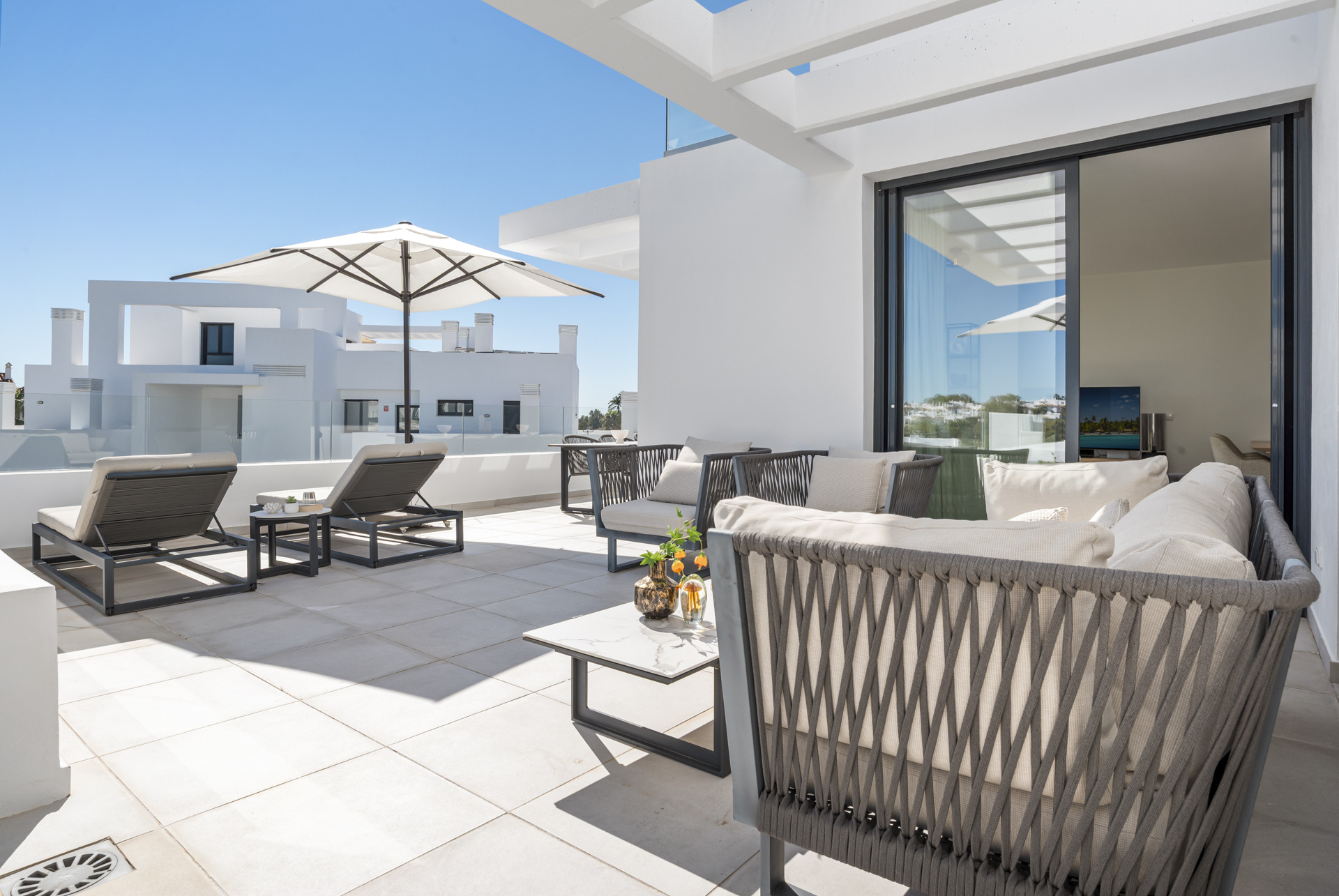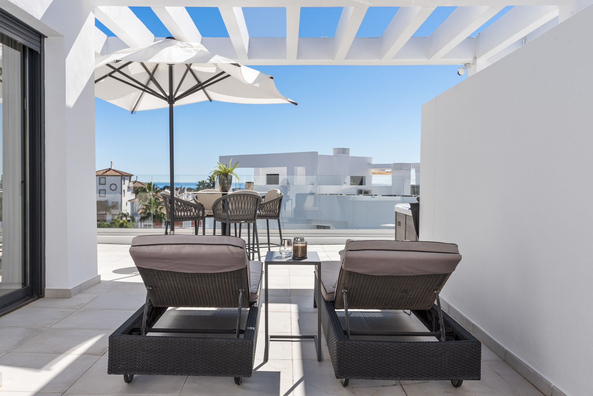 What truly sets this property apart is its exceptional outdoor space. The spacious main terrace overlooks the impressive communal swimming pool and landscaped gardens, creating a relaxing setting for morning coffee or evening dining. Upstairs, the private rooftop solarium offers beautiful sea views and features a jacuzzi, providing the perfect place to unwind while enjoying the Costa del Sol climate. The development itself boasts a very large pool area and well-maintained communal spaces, and the apartment enjoys a privileged position overlooking the pool. Ideally located, it is just a 10-minute walk to local shops and amenities, a 5-minute drive (approximately 20 minutes on foot) to the sandy beach, and only 10 minutes by car to Puerto Banús. Surrounded by renowned golf courses in the El Paraíso and Atalaya area, this property delivers style, location and lifestyle in equal measure.