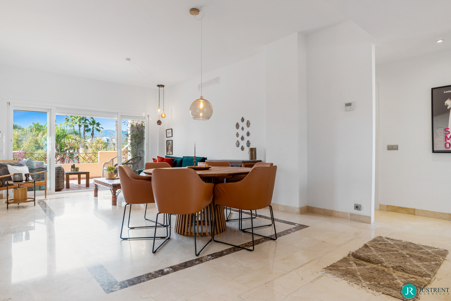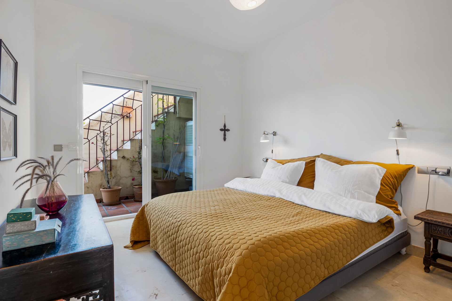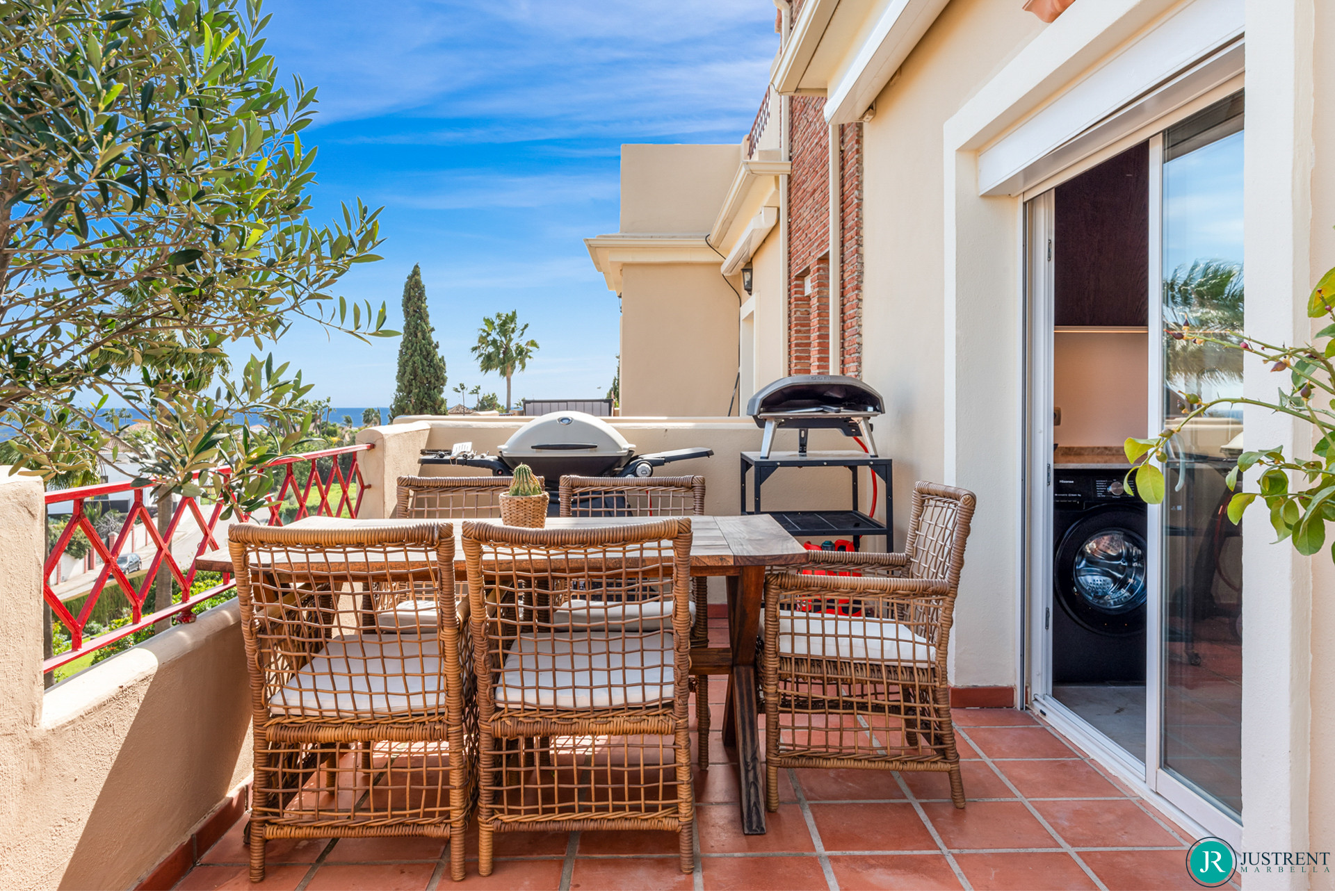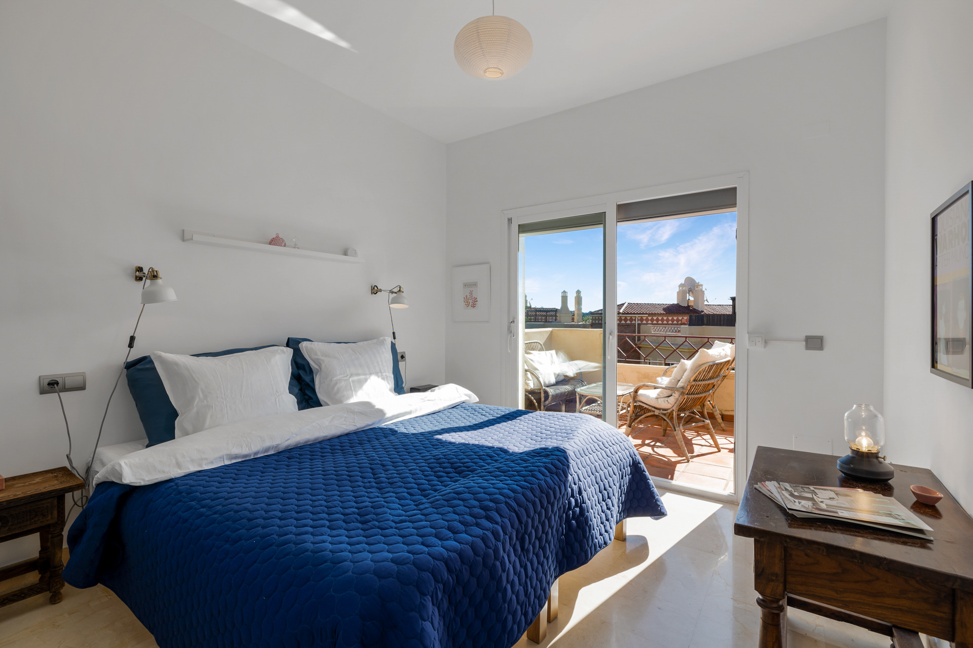There are 3 double bedrooms, all with King sized beds (180cm). The Master has an ensuite bathroom and a large walk-in closet. The other two bedrooms share a bathroom with a bathtub with overhead shower. All bedrooms have access to the terrace.