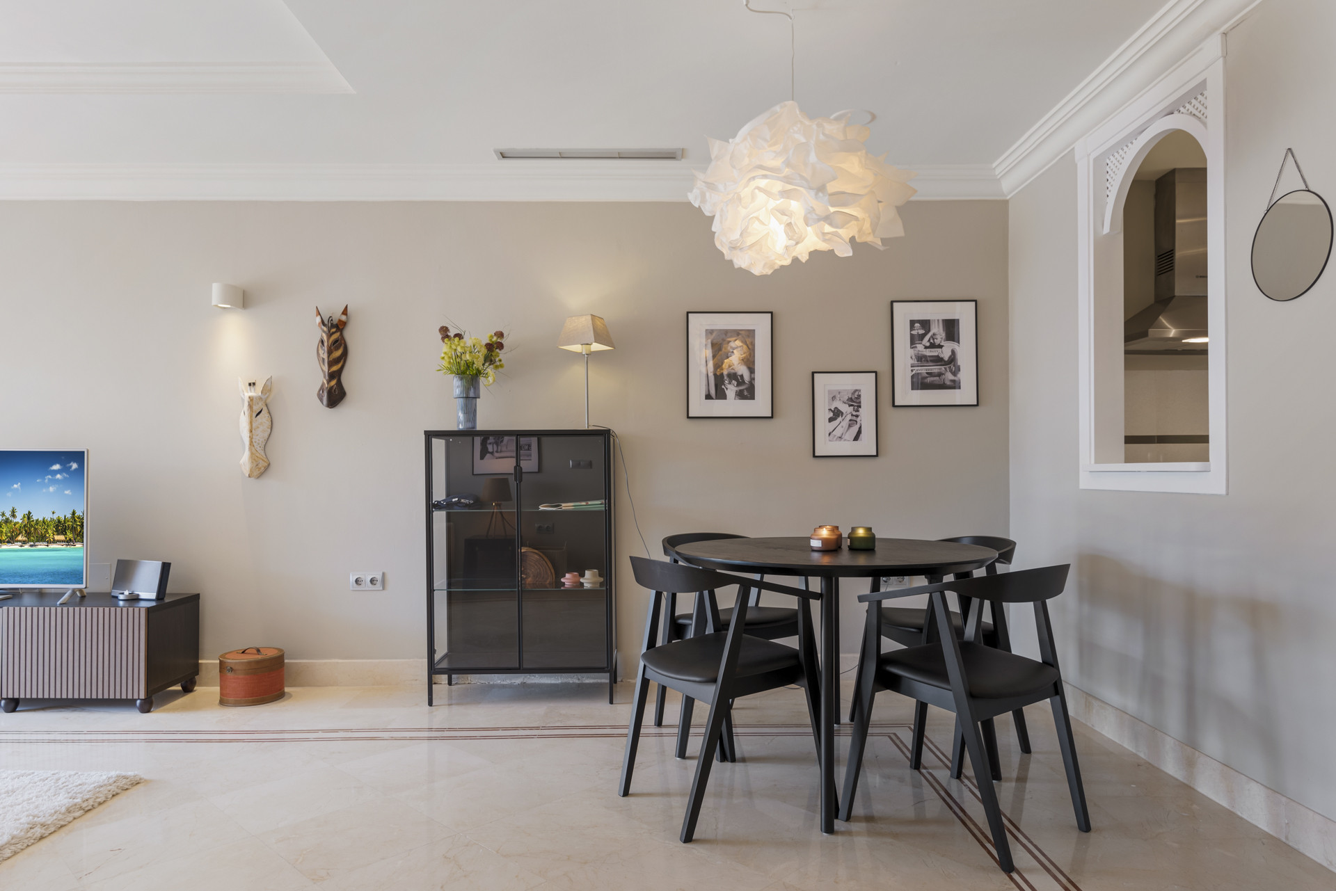 Welcome to Casa Cielo! Casa Cielo is a beautifully presented 2-bedroom, 1-bathroom apartment in Aldea Blanca, offering modern comfort in one of Nueva Andalucía’s most sought-after gated communities. The apartment features a bright open-plan layout where the living, dining, and kitchen areas flow seamlessly together, creating a spacious and sociable environment filled with natural light. Large sliding glass doors connect the interior directly to the terrace, enhancing the airy feel throughout. One of the bedrooms blends effortlessly into the living area, creating a flexible space that can function as an additional lounge-style room or guest area while maintaining the apartment’s open, contemporary aesthetic. Warm wooden flooring and neutral tones give the home a calm, modern atmosphere.