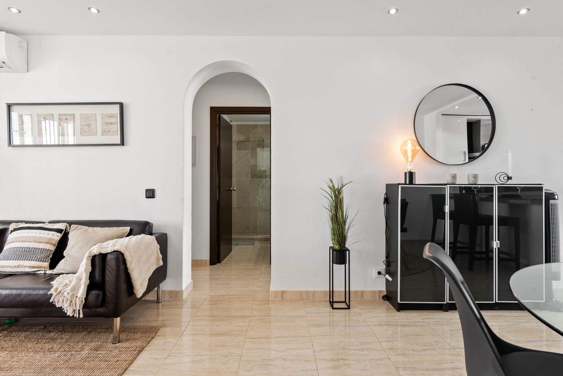 Welcome to Casa Cielo! Casa Cielo is a beautifully presented 2-bedroom, 1-bathroom apartment in Aldea Blanca, offering modern comfort in one of Nueva Andalucía’s most sought-after gated communities. The apartment features a bright open-plan layout where the living, dining, and kitchen areas flow seamlessly together, creating a spacious and sociable environment filled with natural light. Large sliding glass doors connect the interior directly to the terrace, enhancing the airy feel throughout. One of the bedrooms blends effortlessly into the living area, creating a flexible space that can function as an additional lounge-style room or guest area while maintaining the apartment’s open, contemporary aesthetic. Warm wooden flooring and neutral tones give the home a calm, modern atmosphere.