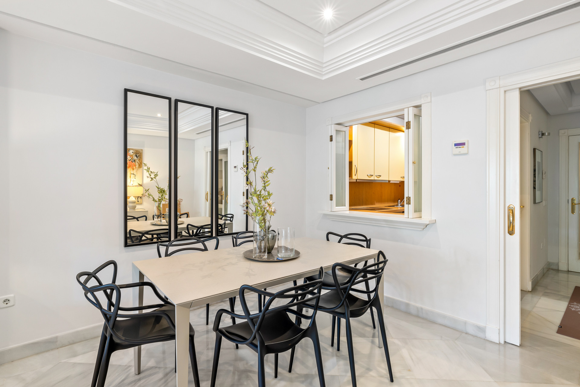 The fully equipped kitchen has a ‘window’ with sliding glass panes that opens onto the dining area.