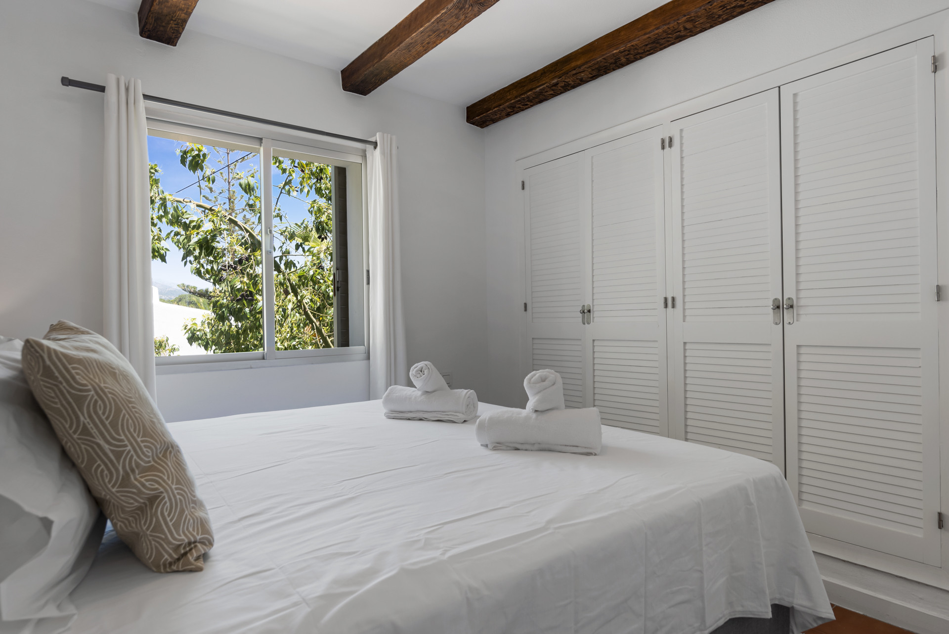 Heading into the master bedroom, you’ve got a lovely large bed, a large Smart TV on the wall to enjoy those weekend lie-ins, a walk-in closet, meaning plenty of storage space and all the time in the world to weigh up your options before heading into the neighbouring areas of Nueva Andalucia or Puerto Banus for a meal or evening out and about. There are sliding doors to the terrace.