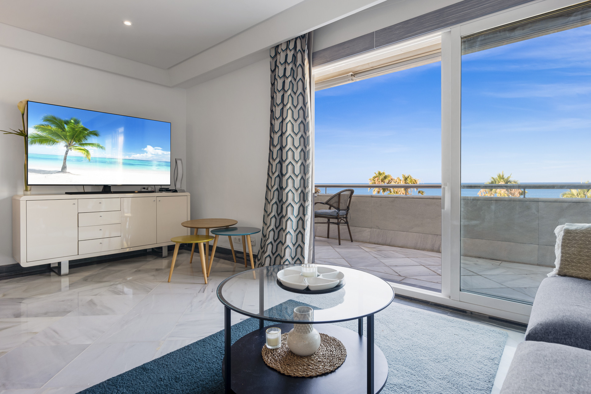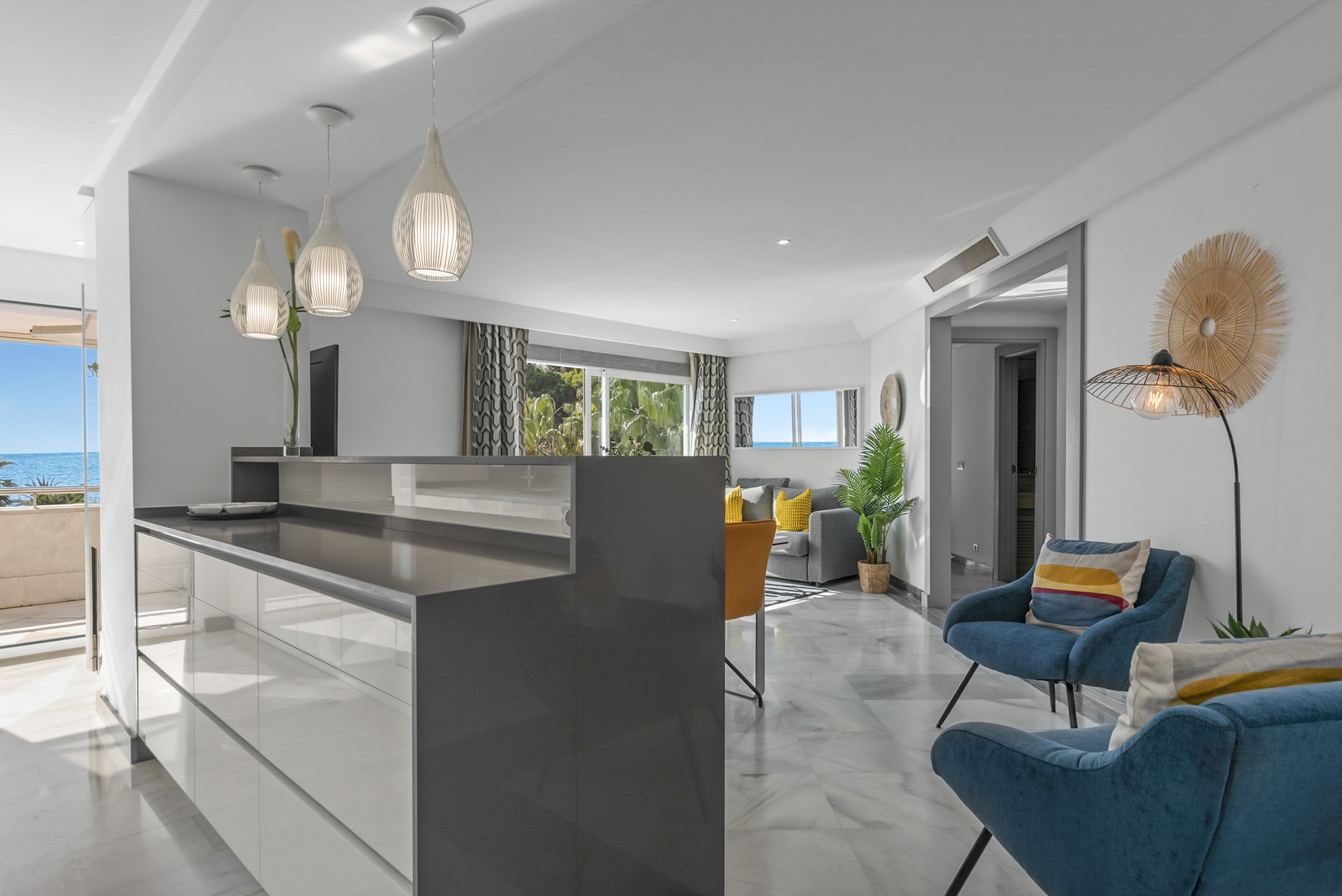 As you step into the apartment, you're greeted by an atmosphere of soothing comfort. The apartment features a spacious layout with fresh colours, furnishings and decor, creating a stylish yet inviting ambiance. From the living room, kitchen, terrace and bedrooms you will be overwhelmed by the wonderful views of the sea and Marbella's golden mile boardwalk.