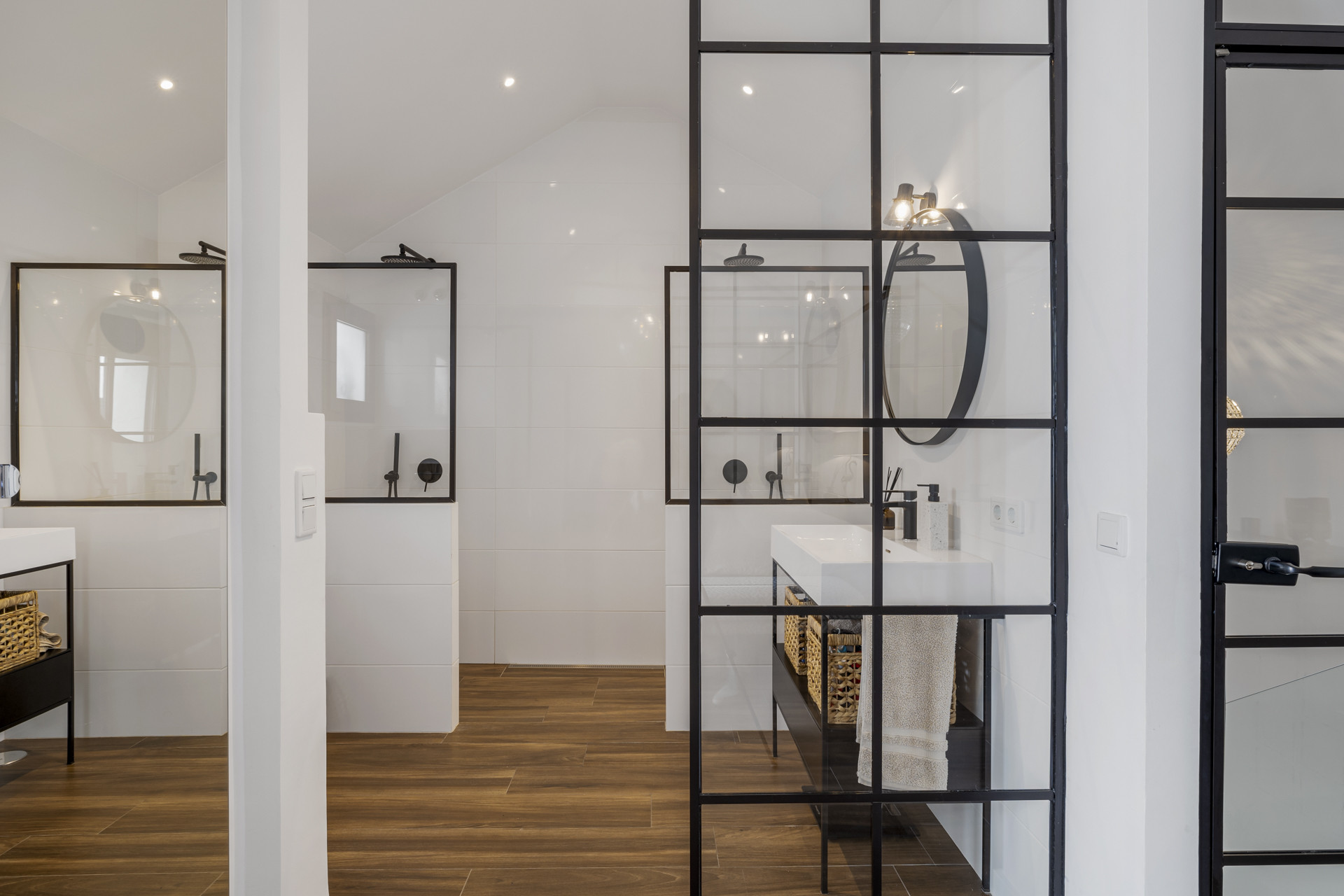 The top floor is the Master suite with a unique glass-fronted ensuite bathroom with double showers. There is a desk next to the four-poster double bed. From here you can access the lovely roof terrace! There are 2 sunbeds and a seating area. This is the perfect space for sunbathing, or chilling while soaking up the mountain views.