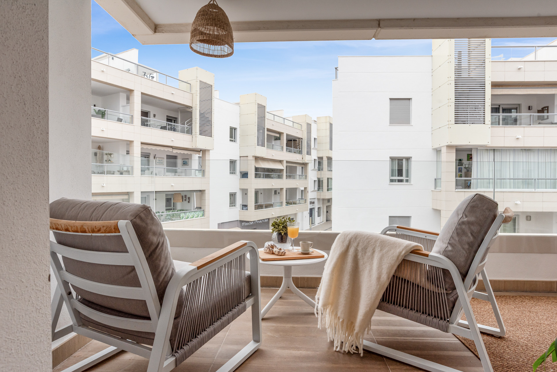 Step outside onto the private balcony, where you can enjoy your morning coffee or a relaxed evening meal. The balcony features two comfortable chairs and an outdoor dining table, perfect for enjoying the warm Marbella climate.