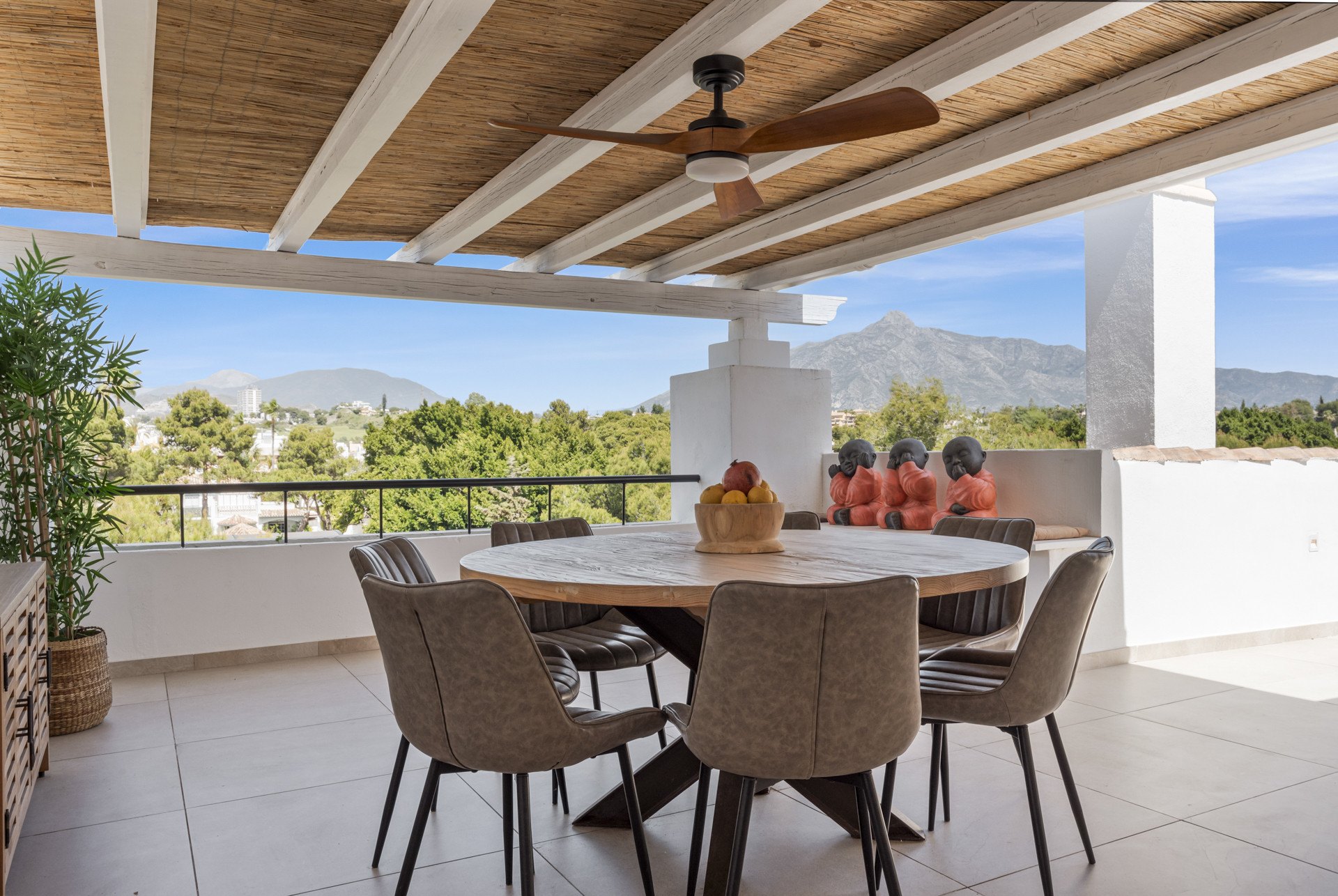 Welcome to Penthouse Mirador del Rodeo 1.2, a stylishly renovated 4-bedroom, 3-bathroom duplex penthouse tucked between Puerto Banús and San Pedro. With tasteful design, generous space, and a spectacular rooftop setup, this home is ideal for families or groups looking to relax in comfort while staying connected to Marbella’s most iconic destinations.