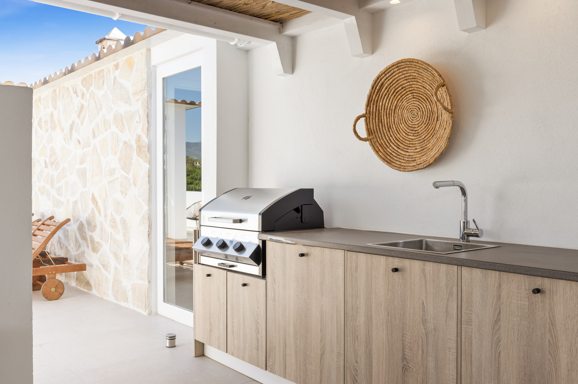 There are three well-appointed bedrooms offering comfortable bedding and built-in storage, with an extra fourth double bed on its own. The master bedroom features an ensuite bathroom and direct access to the terrace, creating a lovely private retreat. The guest bedrooms share a second family bathroom that includes both a bathtub and shower, offering flexibility for families and groups.