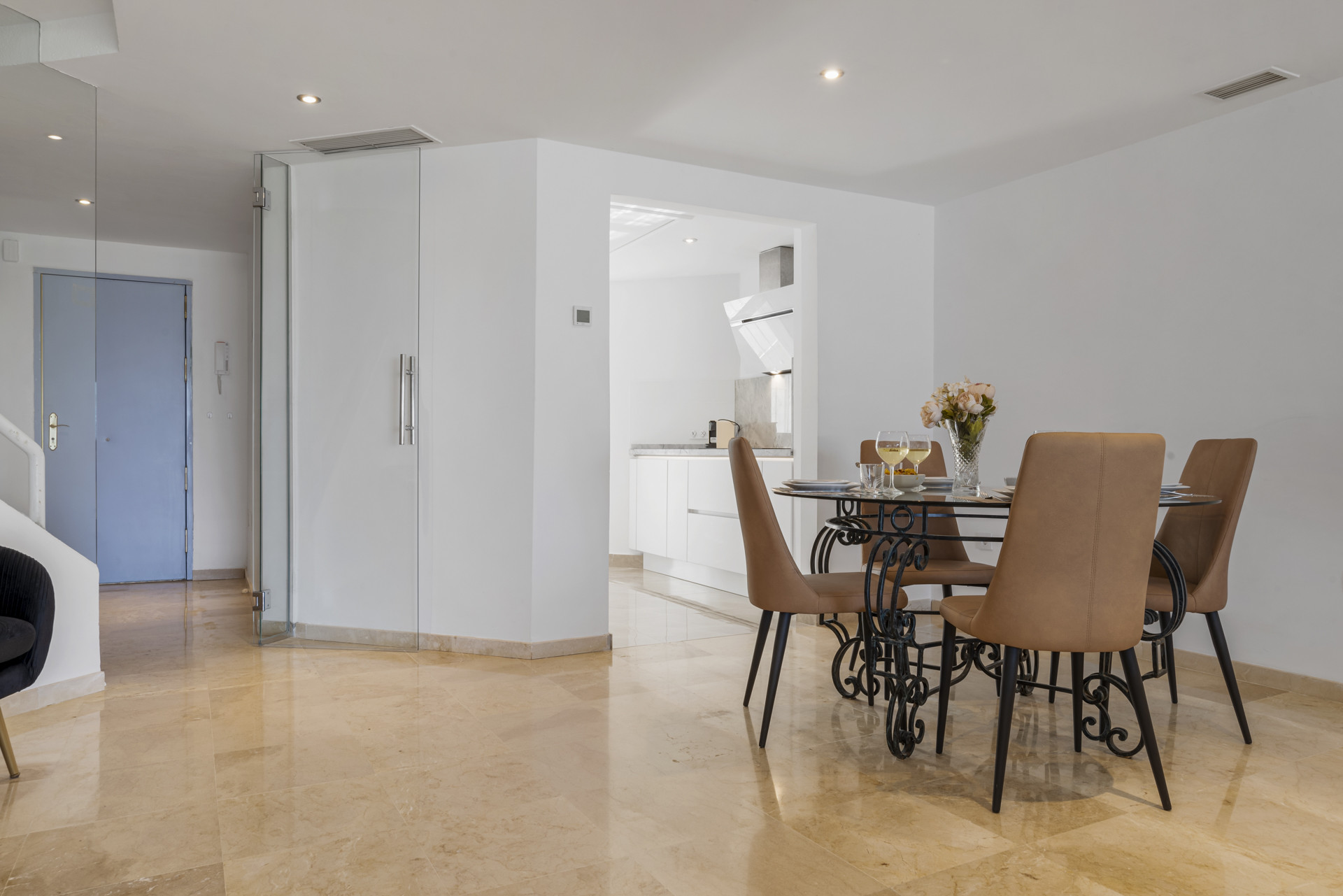 Inside, the property has been tastefully renovated with a clean, modern design. The separate kitchen is fully equipped and finished to a high standard, while the bright living area opens directly onto a spacious private terrace—perfect for al fresco dining or simply relaxing with panoramic sea views. Both bathrooms feature sleek rain showers, combining comfort with a touch of luxury.