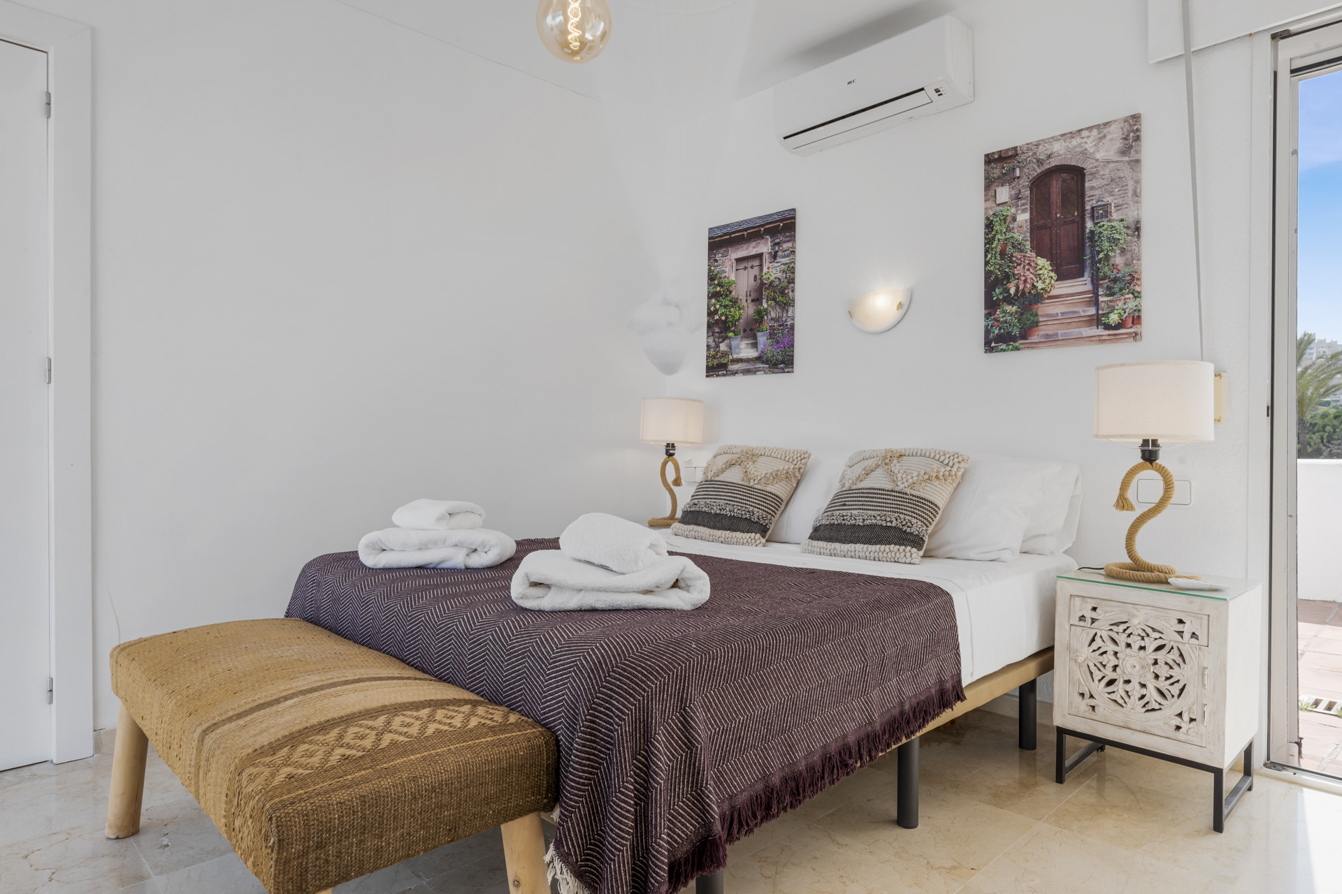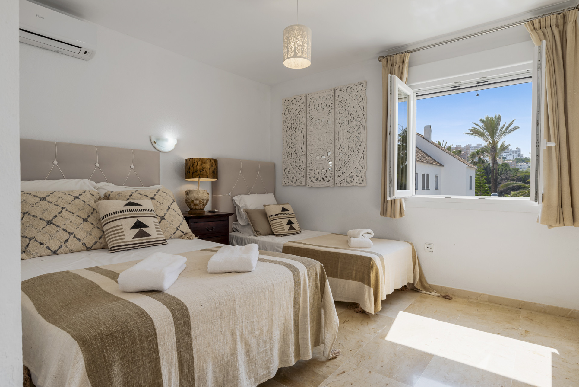 The home comfortably sleeps up to seven guests across three bedrooms, making it ideal for families or small groups. One of the bedrooms includes both a double and single bed, offering flexibility for various sleeping arrangements. Each room is well-furnished and bathed in natural light, creating a calm and welcoming atmosphere throughout the house.