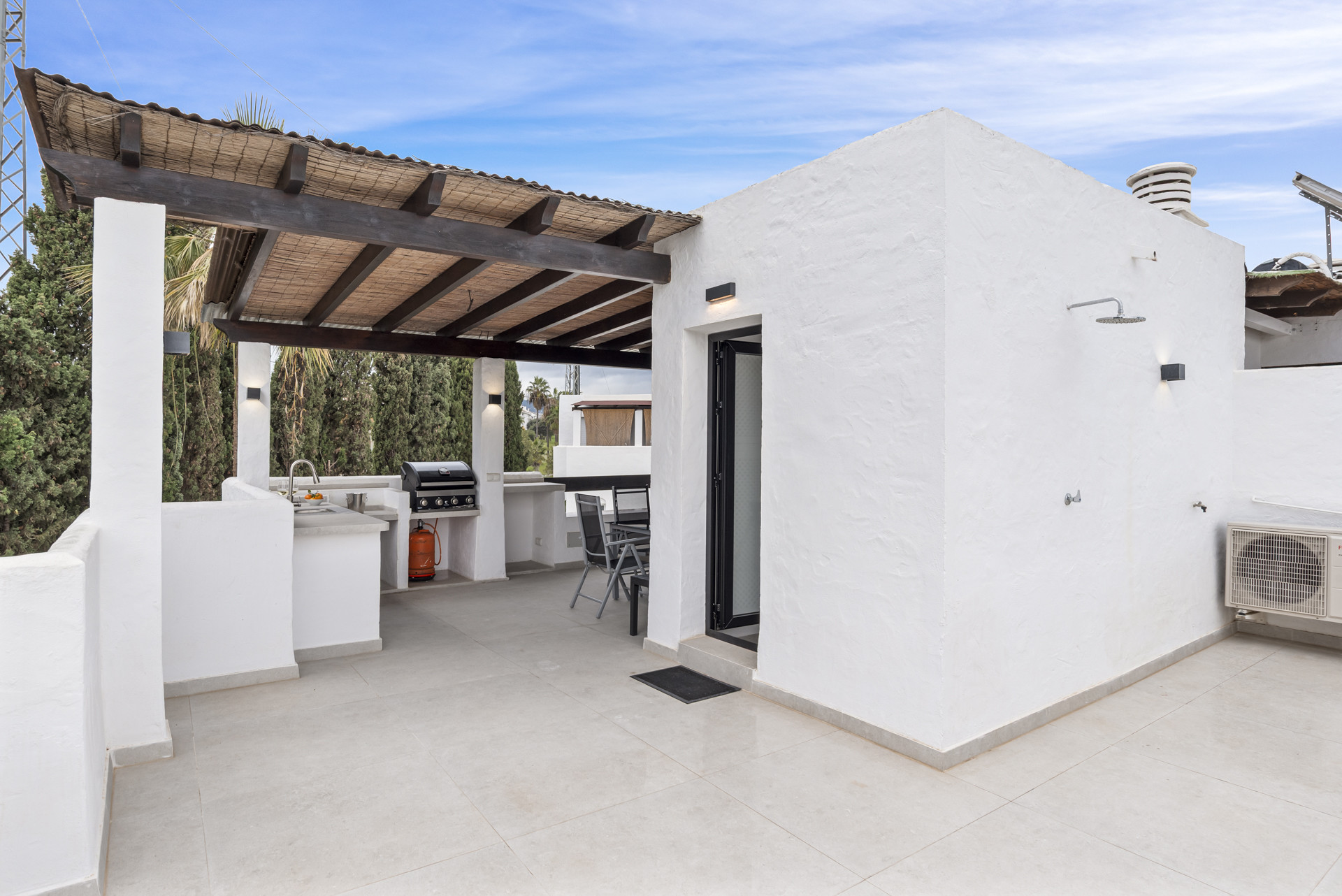 At the top of the house, the impressive roof terrace awaits. It boasts a covered outdoor kitchen with gas BBQ, sink, and a dining table with seating, sun loungers, an outdoor shower, and additional seating areas — all overlooking the peaceful communal grounds.