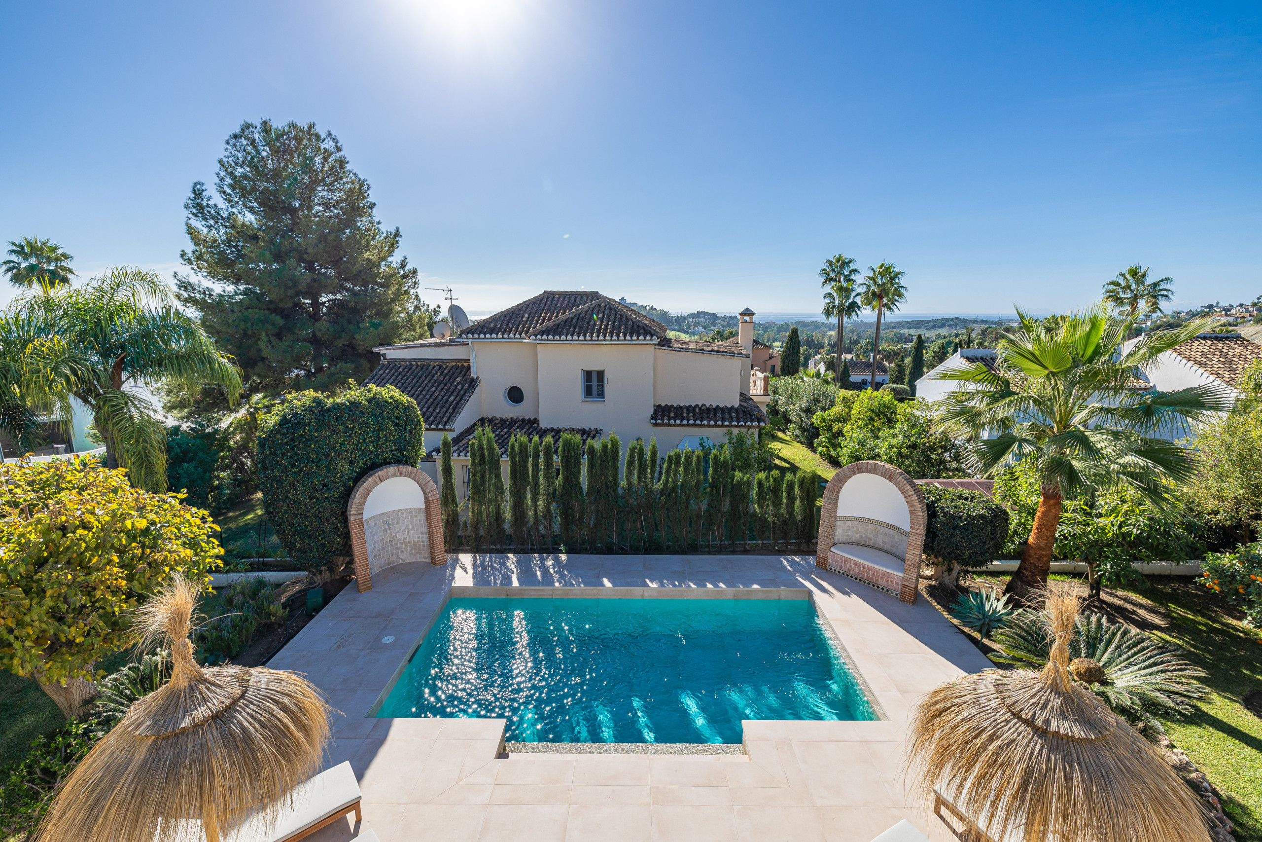 Villa Hakuna Matata – Set within the serene enclave of La Alqueria, this exquisite 4-bedroom villa offers a blend of elegance and comfort, capturing captivating views of the golf course, La Concha mountain, and a glimpse of the Mediterranean Sea. The property’s design emphasizes light and space, with expansive windows framing the scenic landscape and flooding the interiors with natural light.Inside, the open-plan living and dining areas connect seamlessly to a well-appointed kitchen, ideal for hosting or relaxed evenings in. Each bedroom has been crafted as a private sanctuary, offering comfort and tasteful decor with easy access to views or the outdoor spaces.Outside, the villa’s terrace and private pool area provide an inviting spot to unwind, whether enjoying a morning coffee with mountain views or an evening swim. The landscaped gardens further enhance the sense of tranquility, making Villa Hakuna Matata not only a refined retreat but a perfect home to embrace the serene Costa del Sol lifestyle.Please note that we welcome families and couples only, no groups under 30, and no hen or stag parties. Should you fall outside of this category but wish to book nonetheless, please send us an enquiry detailing a bit more about yourself and the group that you will be travelling with so we can request this for you.We look forward to welcoming you!