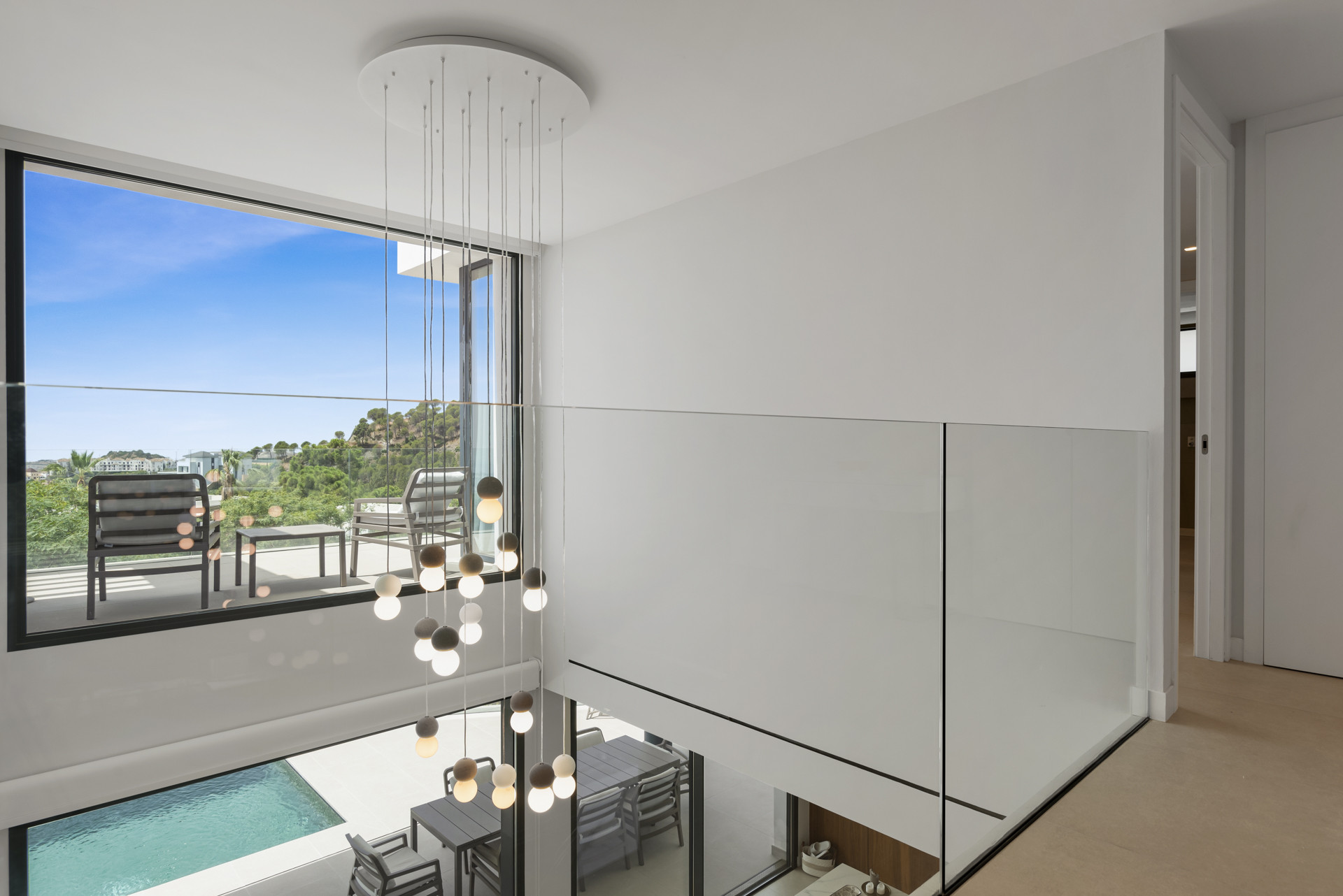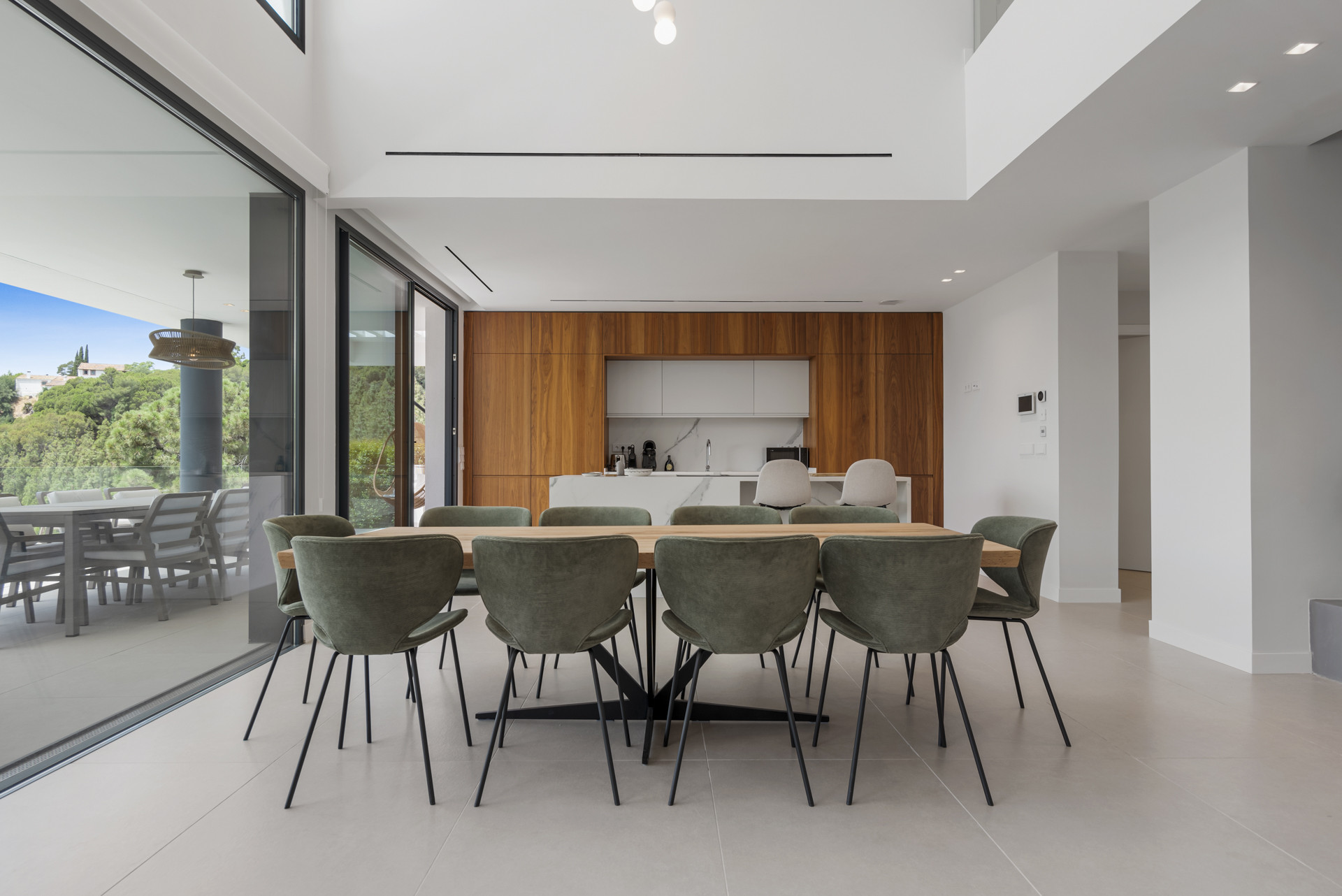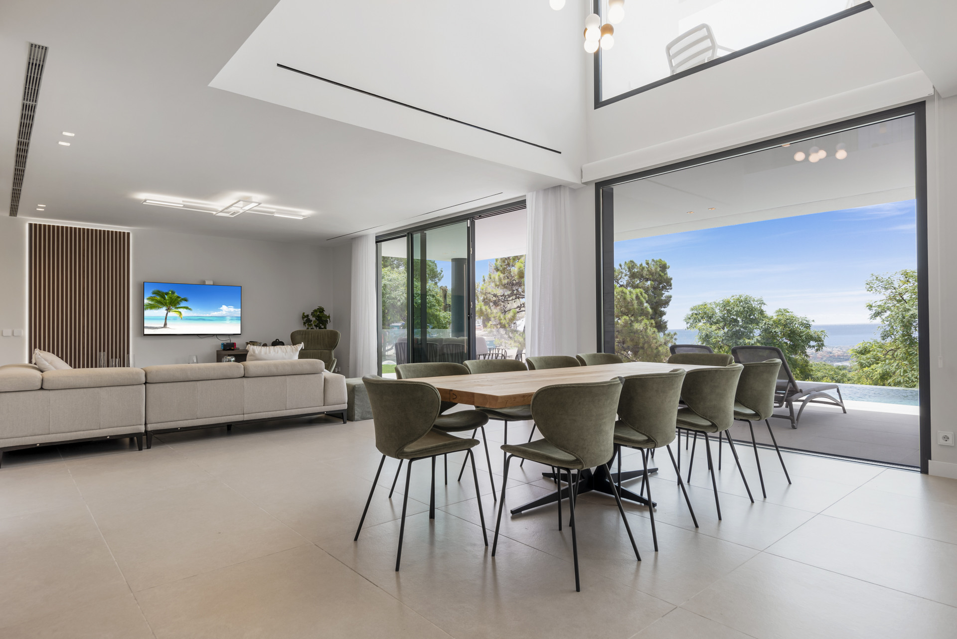 A large open-plan living, dining, and kitchen area coupled with full-size picture windows opening out to the terrace, where you’ll find a beautiful pool and outdoor area perfect for relaxation. The seamless integration of indoor and outdoor spaces creates a harmonious flow, ideal for enjoying the warm Mediterranean climate.