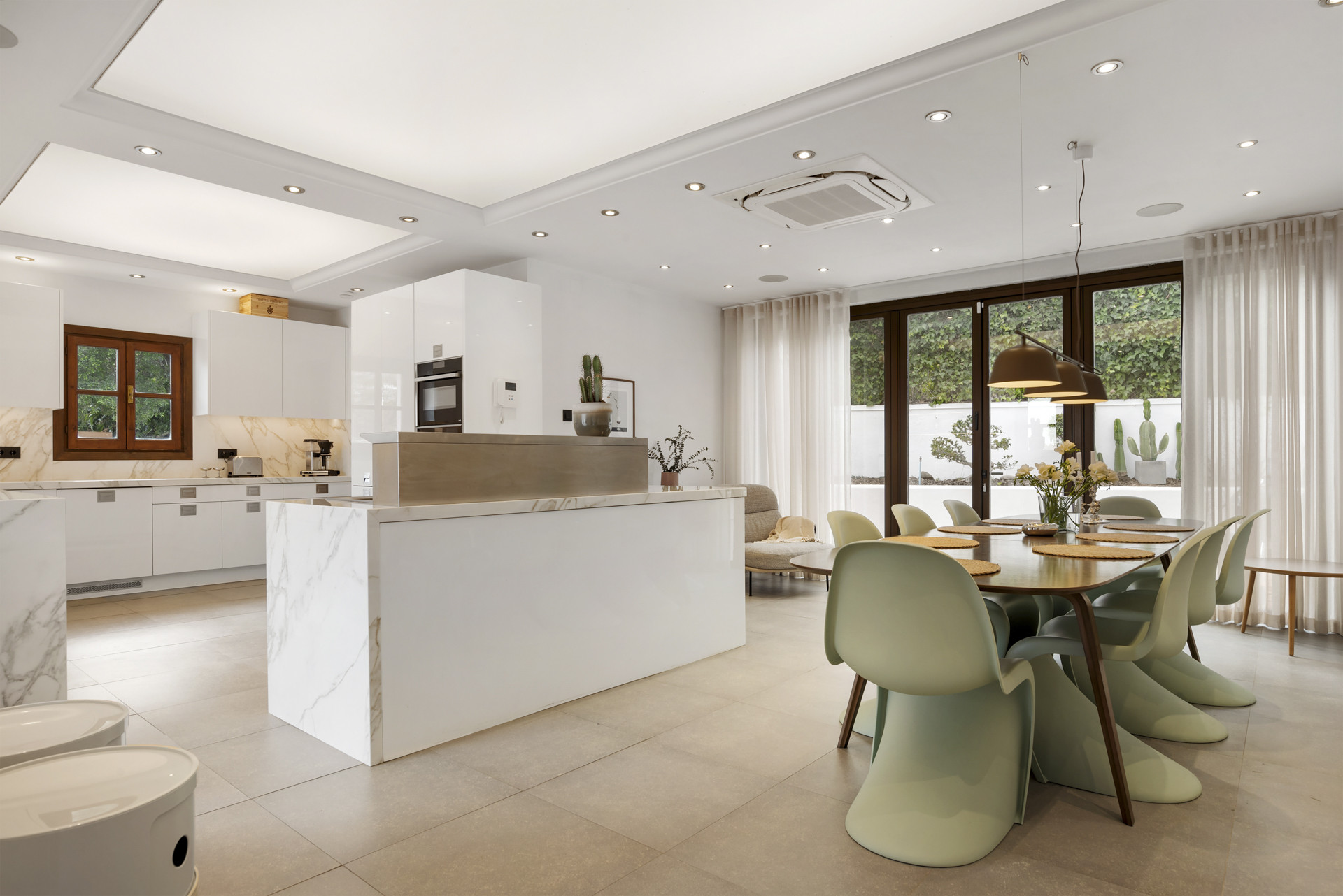 Villa Aguacate is a stunning 4-bedroom (5-bed) villa spanning 350 sqm, nestled in the serene residential enclave of El Paraiso, Marbella. Offering the perfect fusion of Andalusian charm and contemporary design, this home is ideal for those seeking comfort, tranquility, and modern conveniences. Recently upgraded, the villa features a bright and spacious living area that seamlessly extends to a picturesque terrace overlooking the lush garden and sparkling saltwater pool. A covered outdoor dining space creates the perfect setting for al fresco meals, while the fully equipped, newly built modern kitchen boasts top-of-the-line appliances, including a double refrigerator, ensuring ample storage and convenience for guests.