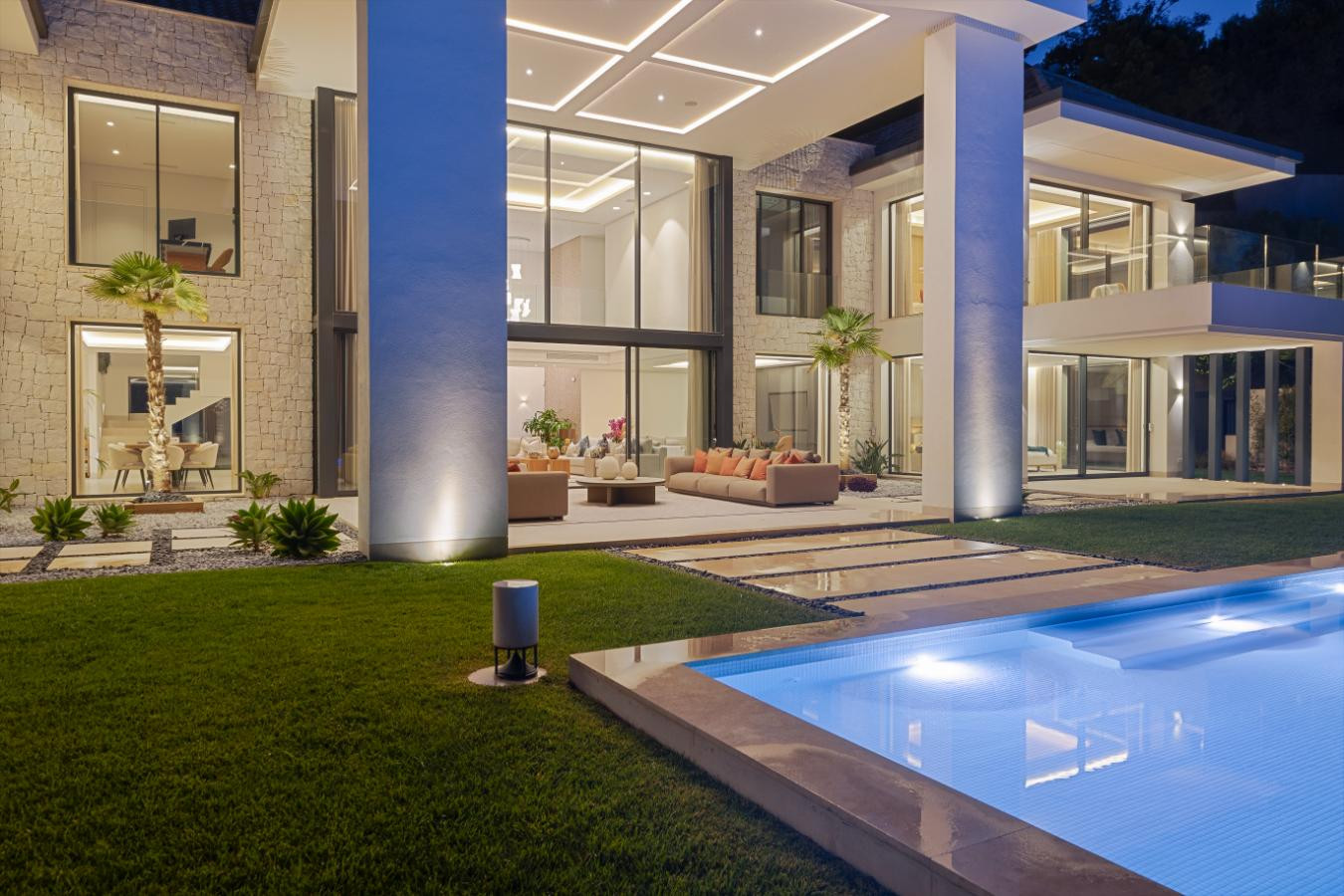 Elegant Interiors: Step inside to find spacious, elegantly designed interiors with high ceilings and floor-to-ceiling windows. The living area, dining space, and modern kitchen are all meticulously decorated to provide comfort and style.