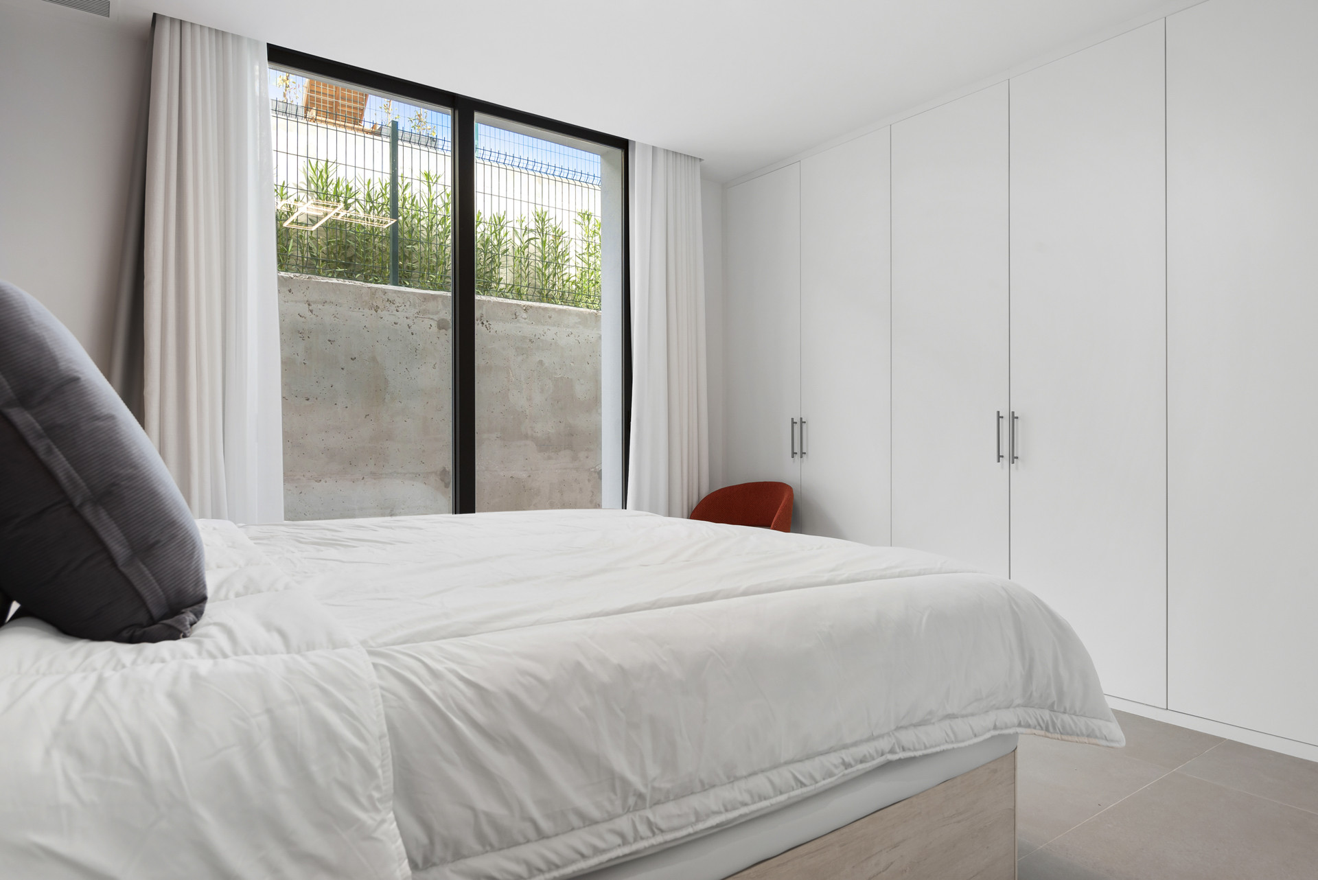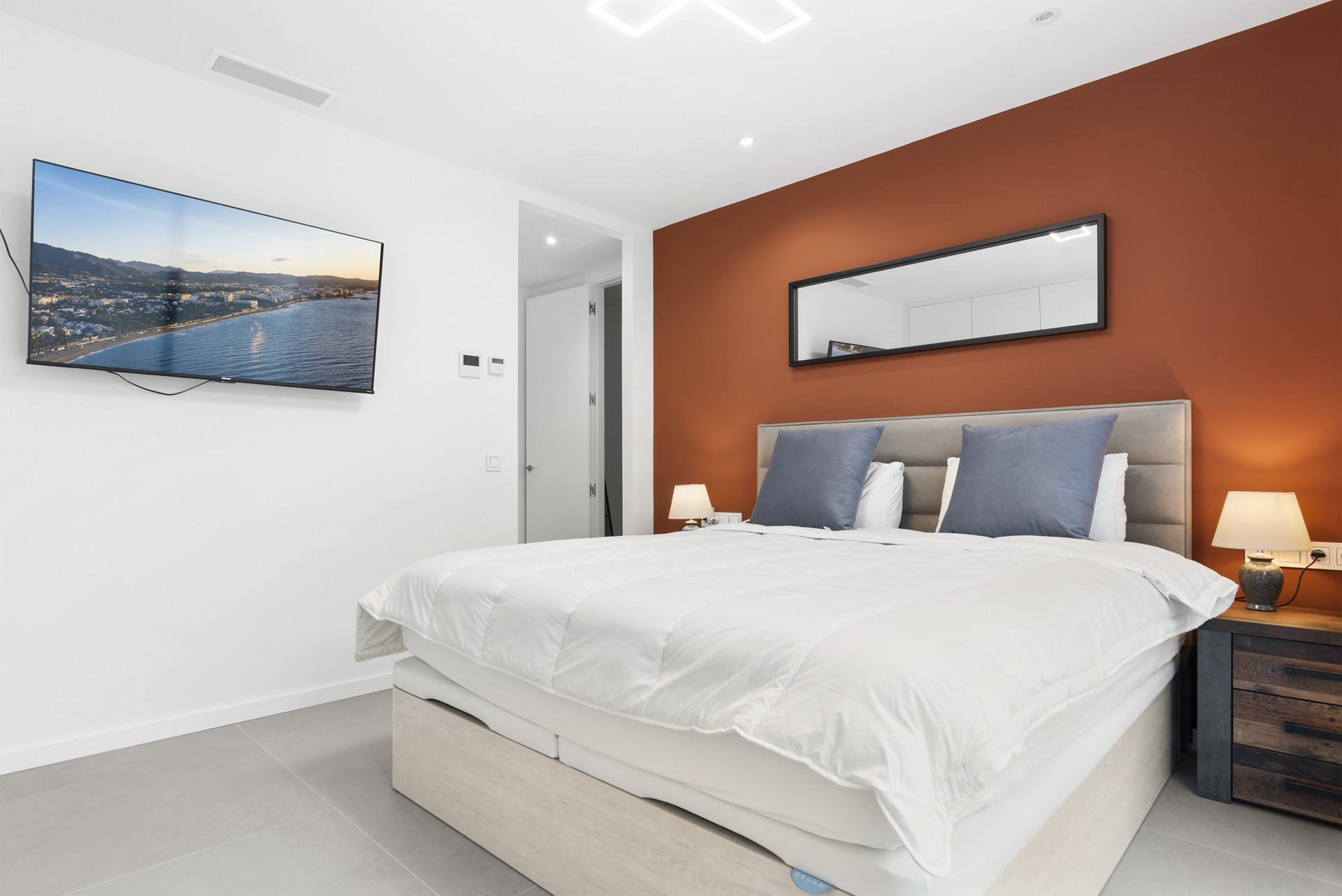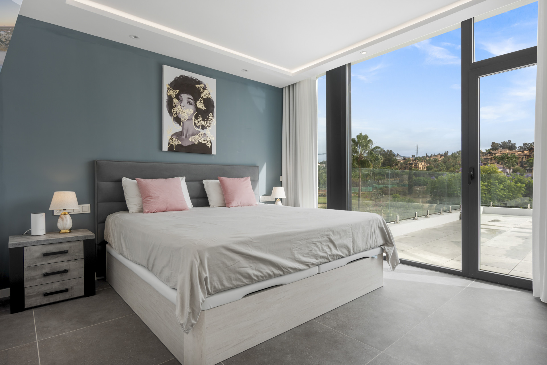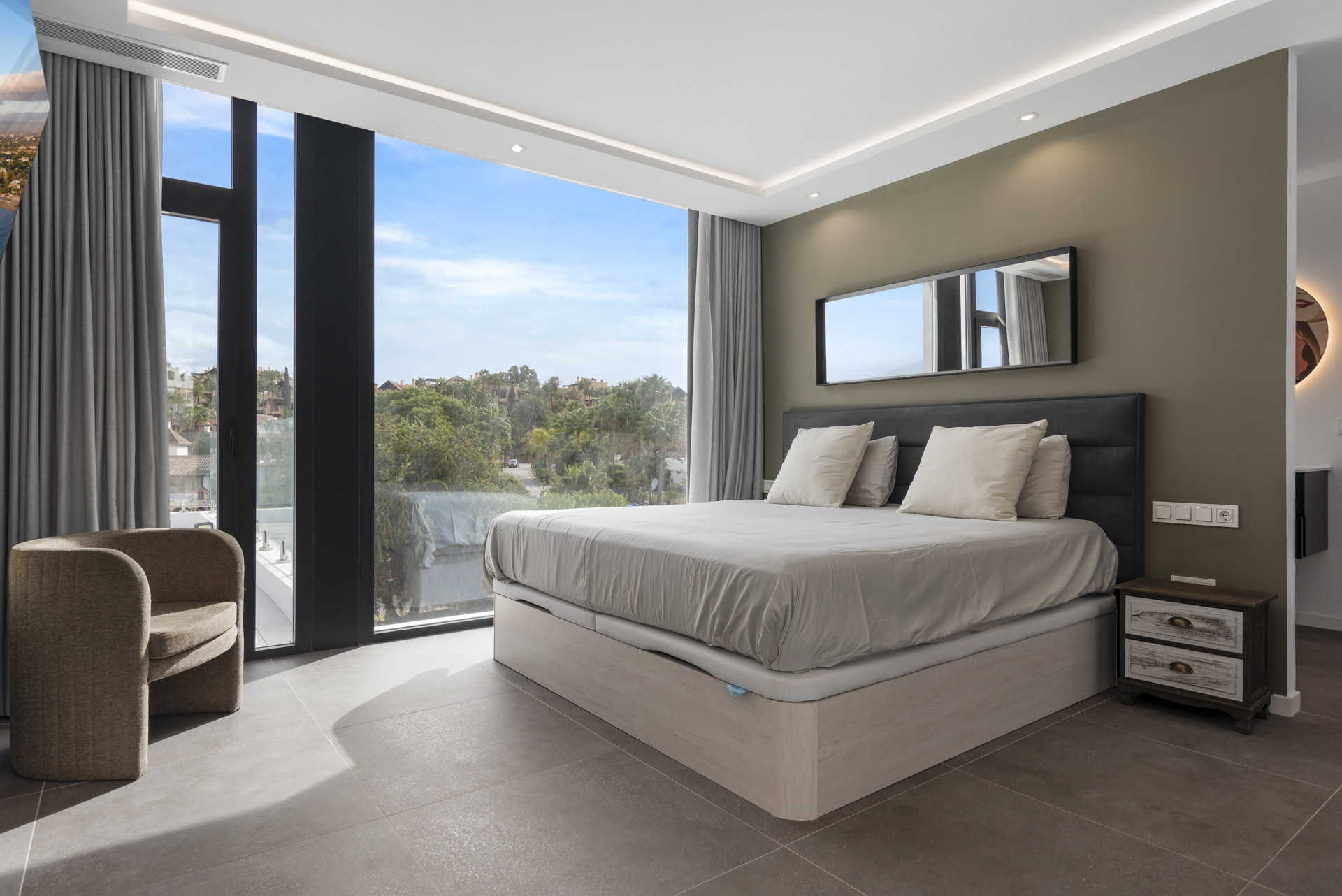 The Master Bedroom is of course stunning. The bed sits parallel to the private terrace access, and you have the pleasure of waking up to the serene views as far as the sea to your right. The ensuite bathroom is just as pretty as the room and complements it perfectly.