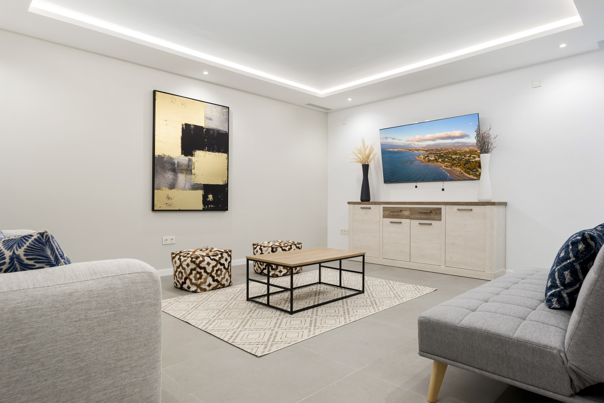 The villa’s open-plan layout is a celebration of modern design, where clean lines, neutral tones, and high-end finishes create a sense of space and tranquility. The living area, adorned with elegant décor, flows effortlessly into a state-of-the-art kitchen, fully equipped with premium appliances and sleek cabinetry. The central island doubles as a breakfast bar, making it an inviting spot for morning coffee or evening socializing.
