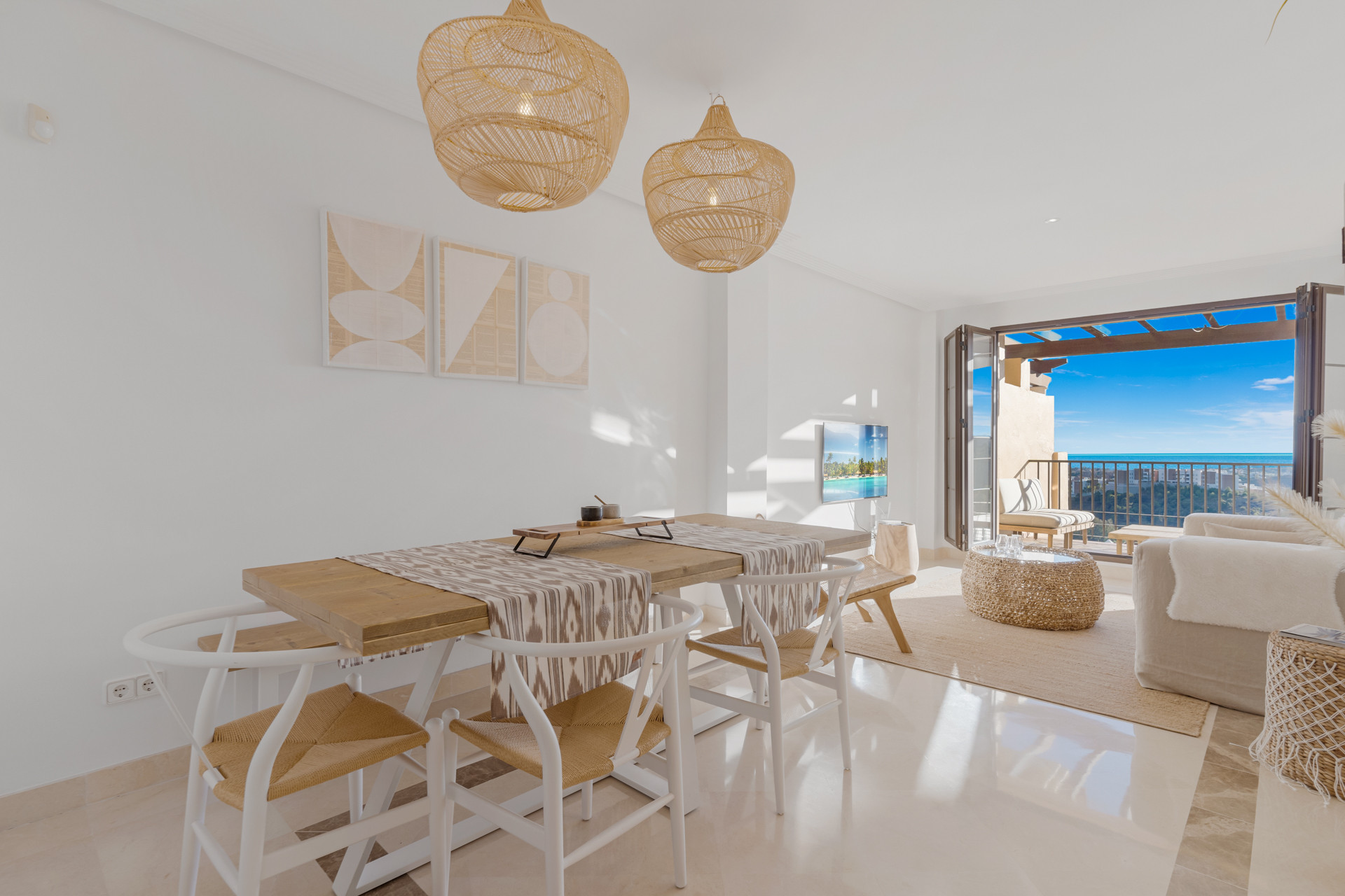 Inuti utstrålar hemmet en lugn och modern känsla. Det huvudsakliga vardagsrummet är rymligt och fyllt med naturligt ljus, med bekväma sittplatser, en matplats och stora glasdörrar som öppnar sig mot en solbelyst terrass. Köket är fullt utrustat med moderna apparater och gott om plats för hemlagade måltider. Alla tre sovrummen är stilfullt inredda, där master bedroom erbjuder ett eget badrum, vilket skapar en lugn och inbjudande atmosfär perfekt för både korta vistelser och längre reträtter.