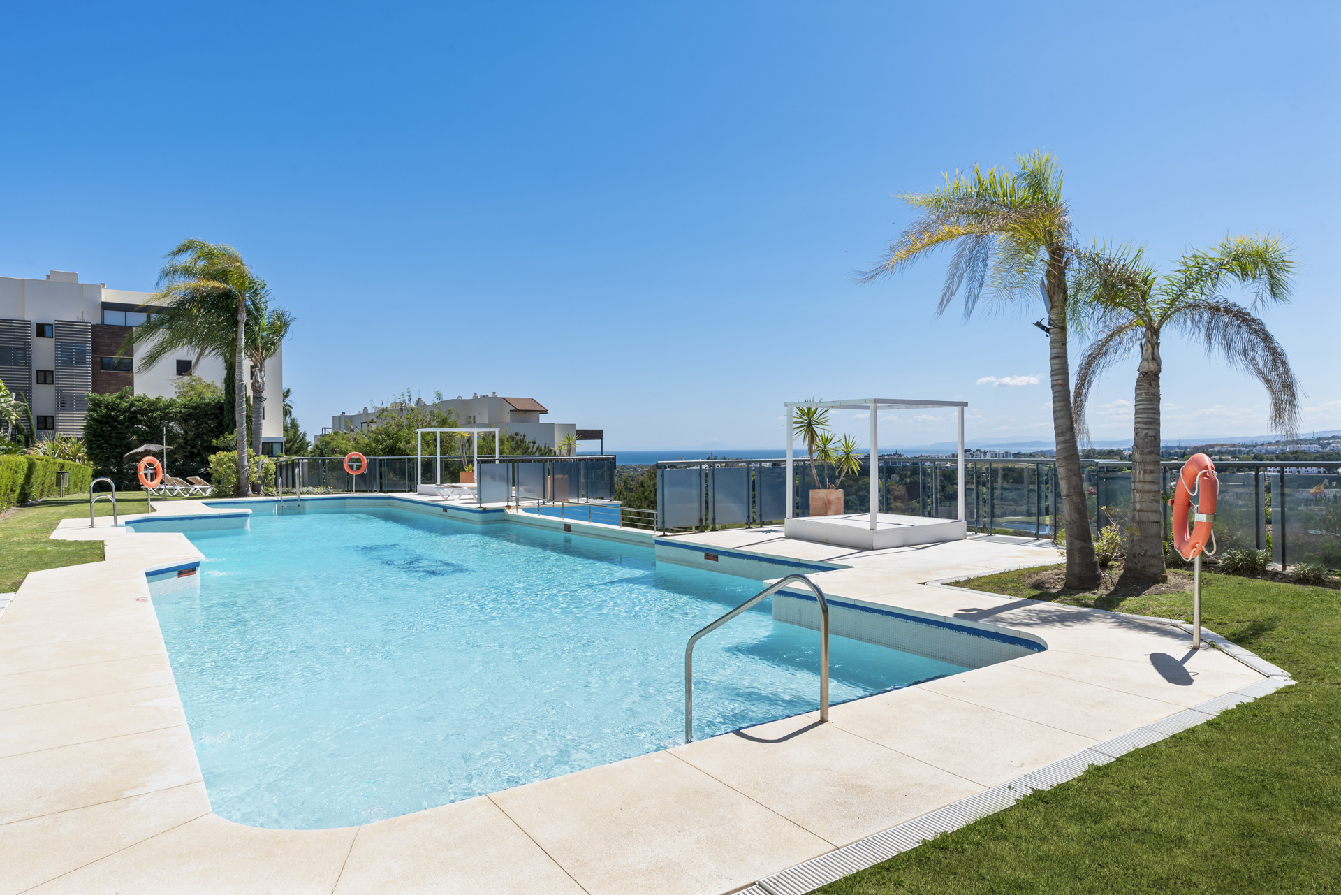 Komplexet erbjuder säker underjordisk parkering och ett vackert poolområde med gemensamma solsängar och fantastisk utsikt över bergen, golfdalen ner till havet, Gibraltar och Marockos kust.