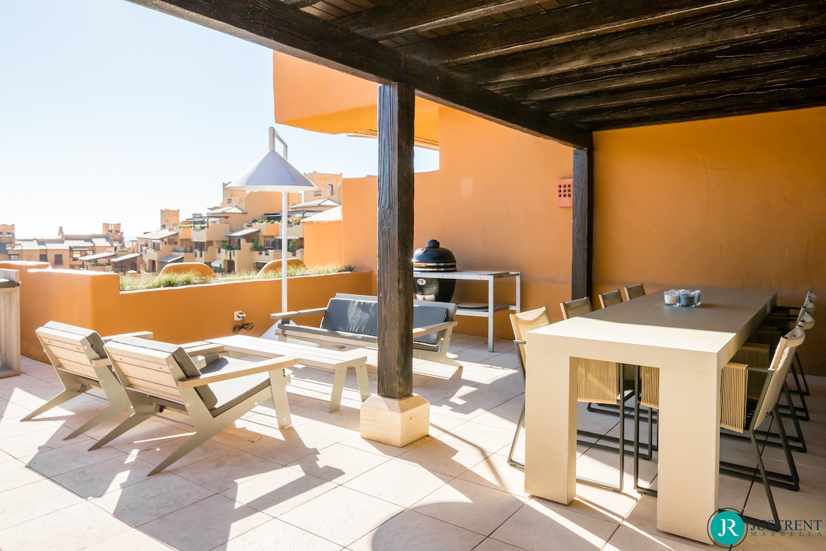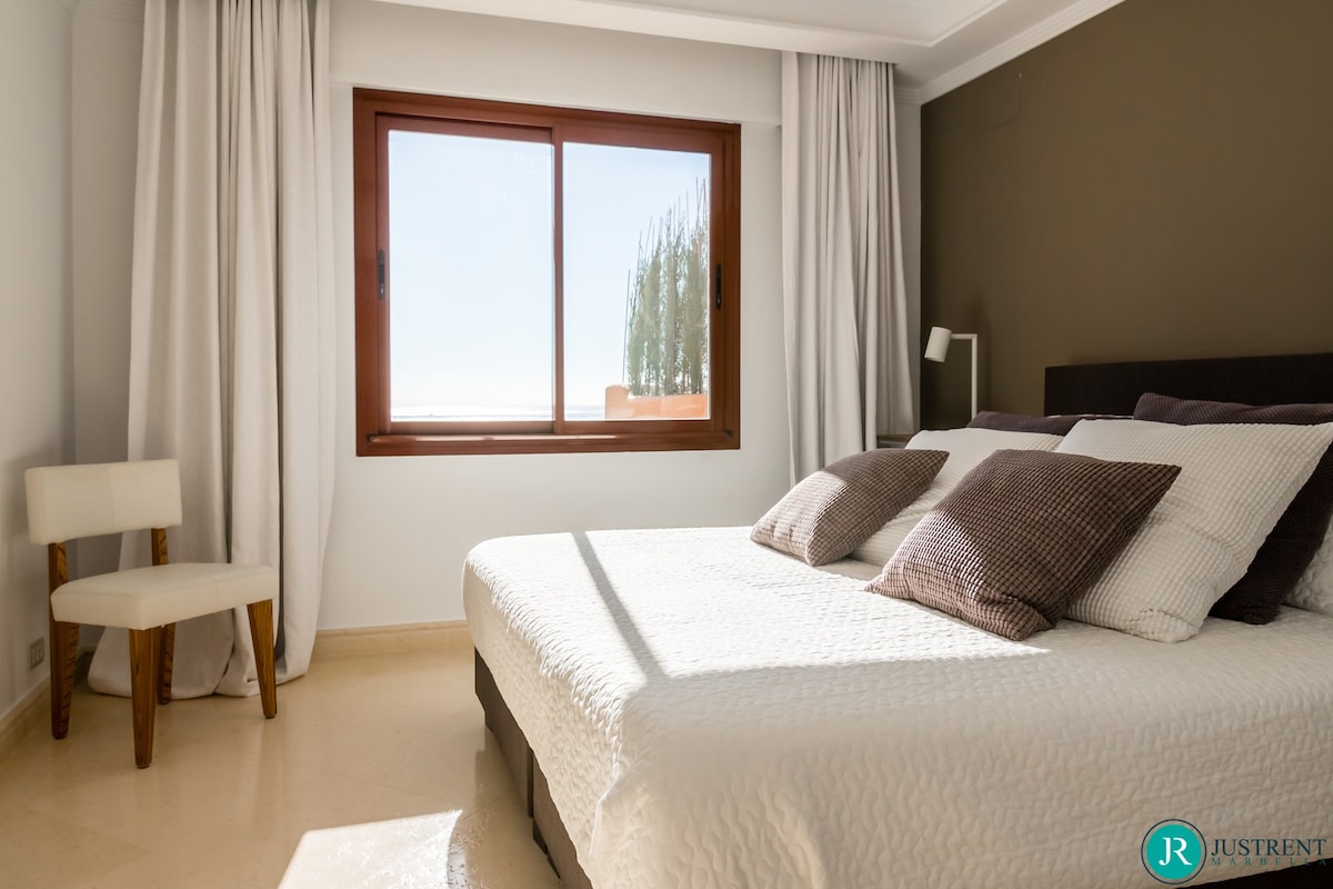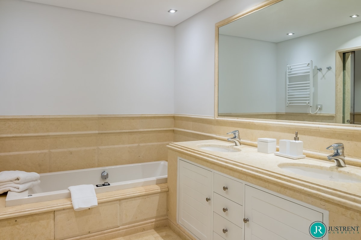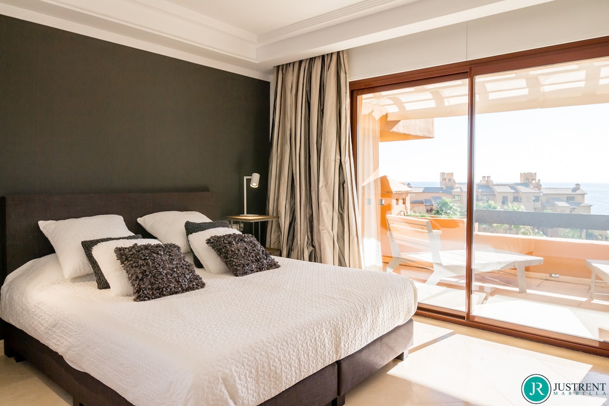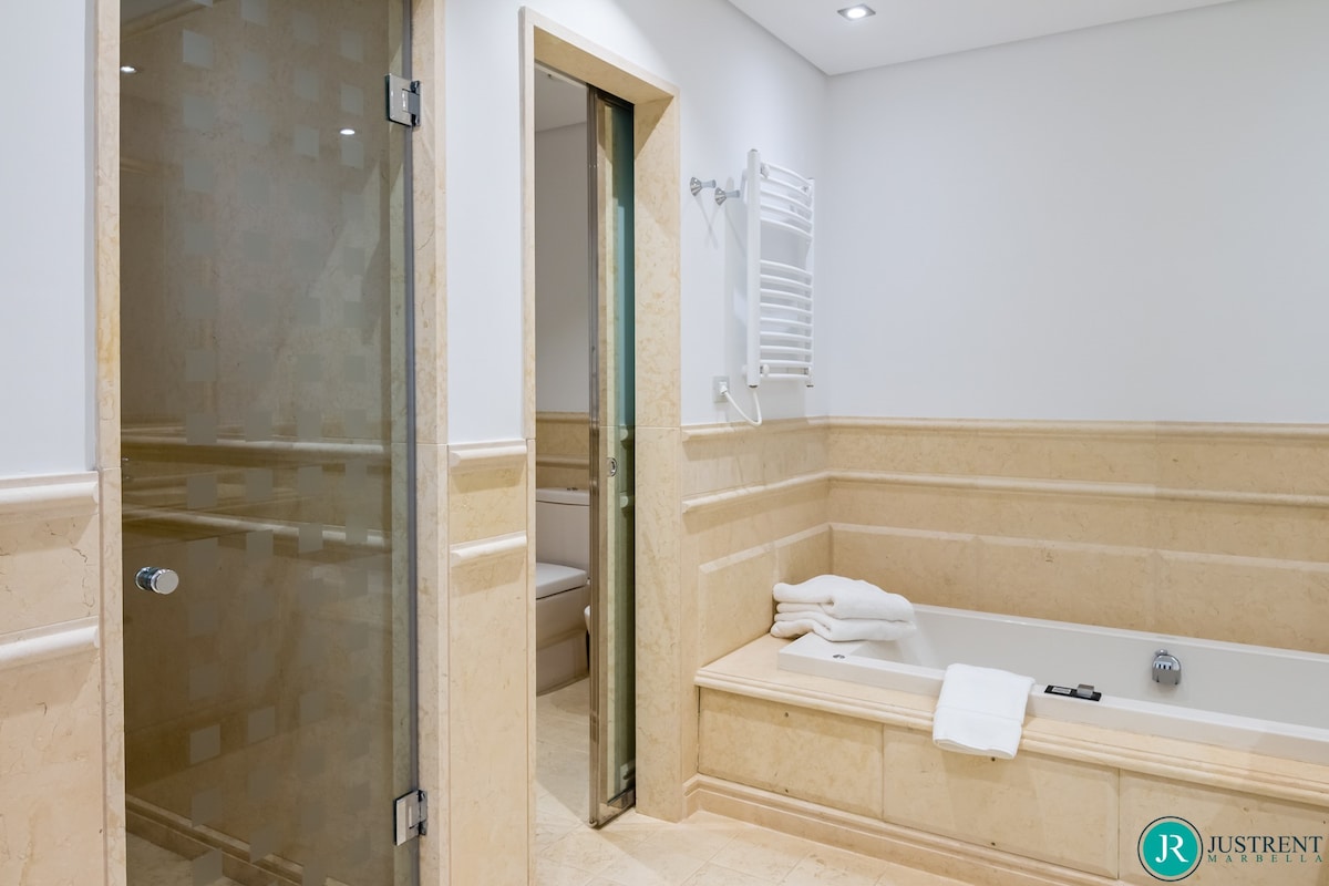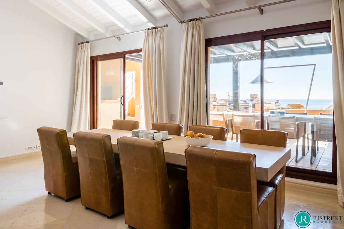 Den/det lägenhet i Estepona har 4 sovrum och en kapacitet för 8 personer. Boende av 249 m² fin och är modernt, ligger i strand, Den har utsikt över havet och bergen. Bostaden ligger 50 m sandstrand, 80 m flyplats, 300 m restaurang, 300 m from coffee shop, 1 km busstation, 2 km mataffär, 3 km from hospital, 5 km stad, 12 km golfbana, 59 km vattenpark, 80 km flyplats och den ligger i ett ett familjevänligt zon och bredvid havet.Boendet är utrustat med följande föremål: hiss, 117 m² terrass, tvättmaskin, torktumlare, grill, strykjärn, internet (Wifi), hårtork, balkong, gym / fitness , spa, elektrisk värme, luftkonditionering i hela huset, pool privat pool, uppvärmd pool kommunal pool, garage in på plats, 1 TV, satellit.Den/det oberoende kök, av vitroceramic, är utrustat med kyl, mikrovågsugn, ugn, frys, diskmaskin, tallrikar/bestick, köksredskap, kaffemaskin, brödrost, vattenkokare, juicemaskin och köksutrustning