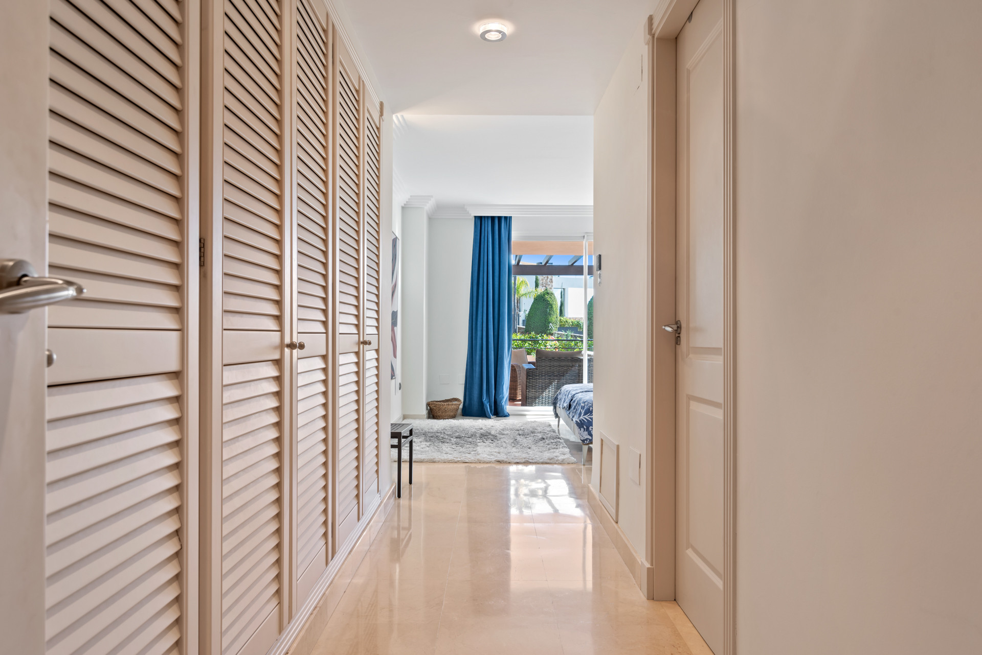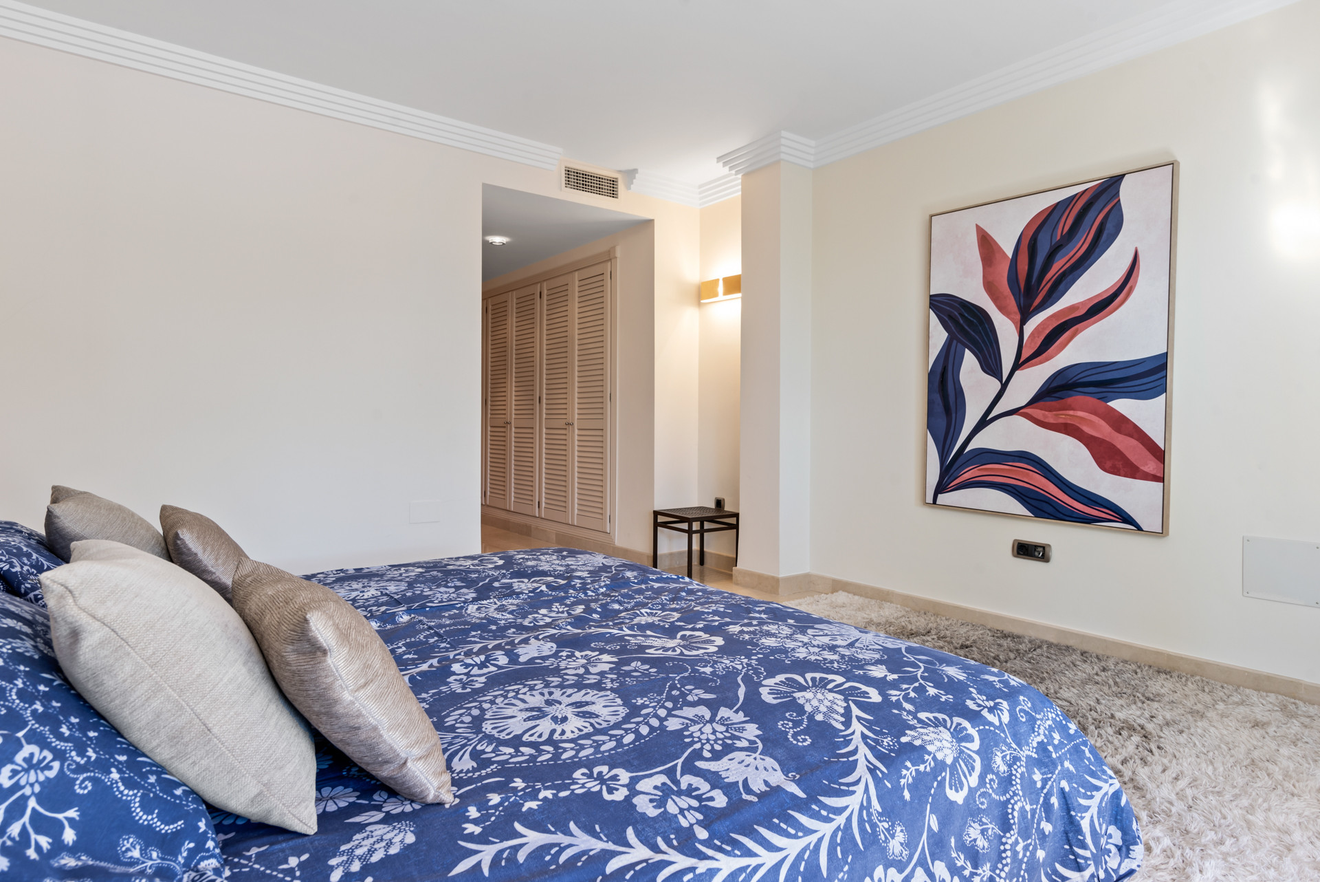 Välkommen till Casa Cielo! Casa Cielo är en vackert presenterad 2-rumslägenhet med 1 badrum i Aldea Blanca, som erbjuder modern komfort i ett av Nueva Andalucías mest eftertraktade inhägnade bostadsområden. Lägenheten har en ljus öppen planlösning där vardagsrum, matplats och kök flyter sömlöst samman och skapar en rymlig och social miljö fylld av naturligt ljus. Stora skjutbara glasdörrar förbinder interiören direkt med terrassen och förstärker den luftiga känslan överallt. Ett av sovrummen smälter obemärkt in i vardagsrummet och skapar ett flexibelt utrymme som kan fungera som ett extra loungerum eller gästområde, samtidigt som lägenhetens öppna, moderna estetik bibehålls. Varma trägolv och neutrala toner ger hemmet en lugn, modern atmosfär.
