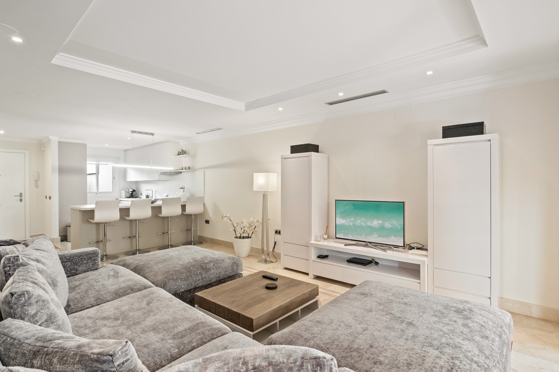 Välkommen till Casa Cielo! Casa Cielo är en vackert presenterad 2-rumslägenhet med 1 badrum i Aldea Blanca, som erbjuder modern komfort i ett av Nueva Andalucías mest eftertraktade inhägnade bostadsområden. Lägenheten har en ljus öppen planlösning där vardagsrum, matplats och kök flyter sömlöst samman och skapar en rymlig och social miljö fylld av naturligt ljus. Stora skjutbara glasdörrar förbinder interiören direkt med terrassen och förstärker den luftiga känslan överallt. Ett av sovrummen smälter obemärkt in i vardagsrummet och skapar ett flexibelt utrymme som kan fungera som ett extra loungerum eller gästområde, samtidigt som lägenhetens öppna, moderna estetik bibehålls. Varma trägolv och neutrala toner ger hemmet en lugn, modern atmosfär.