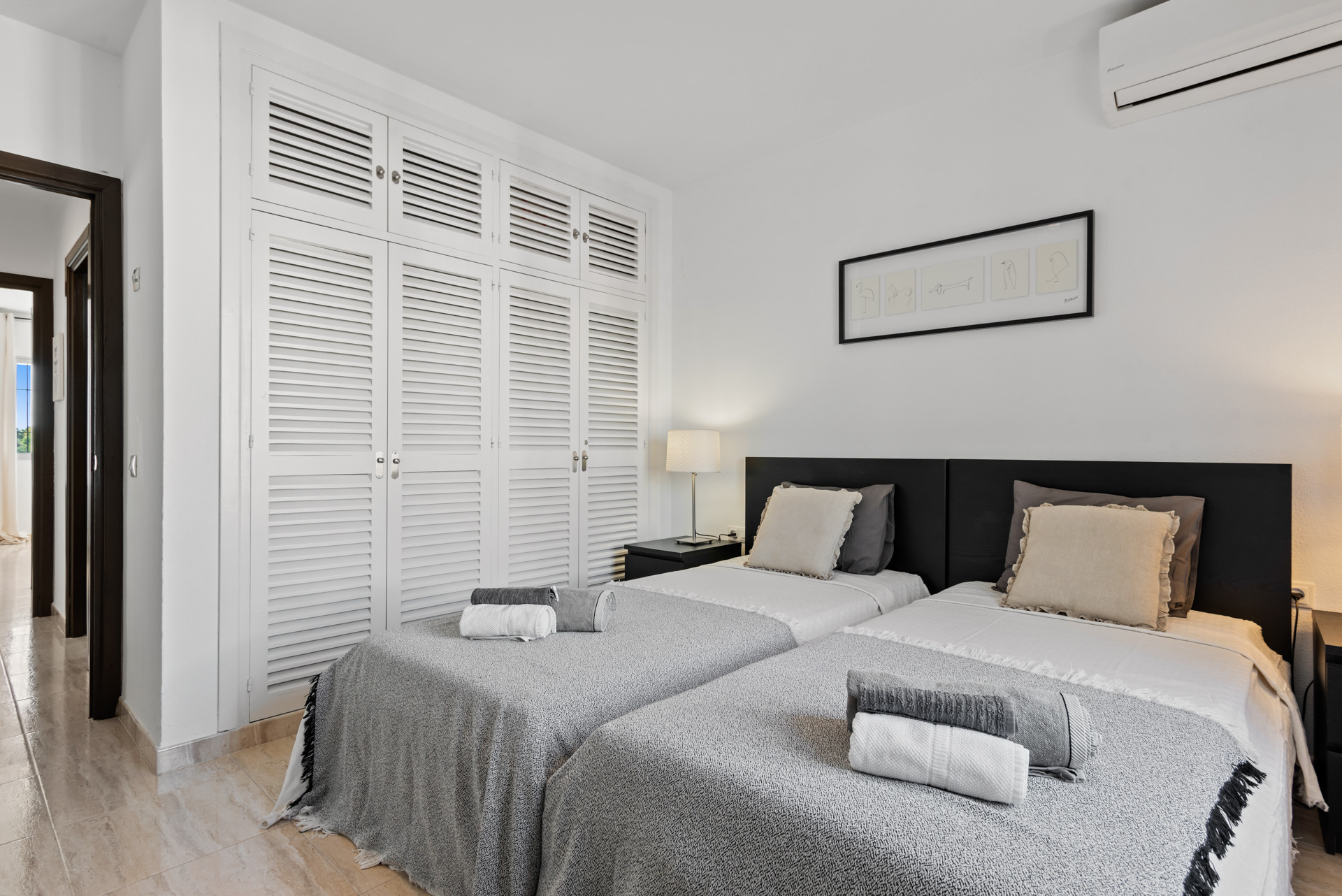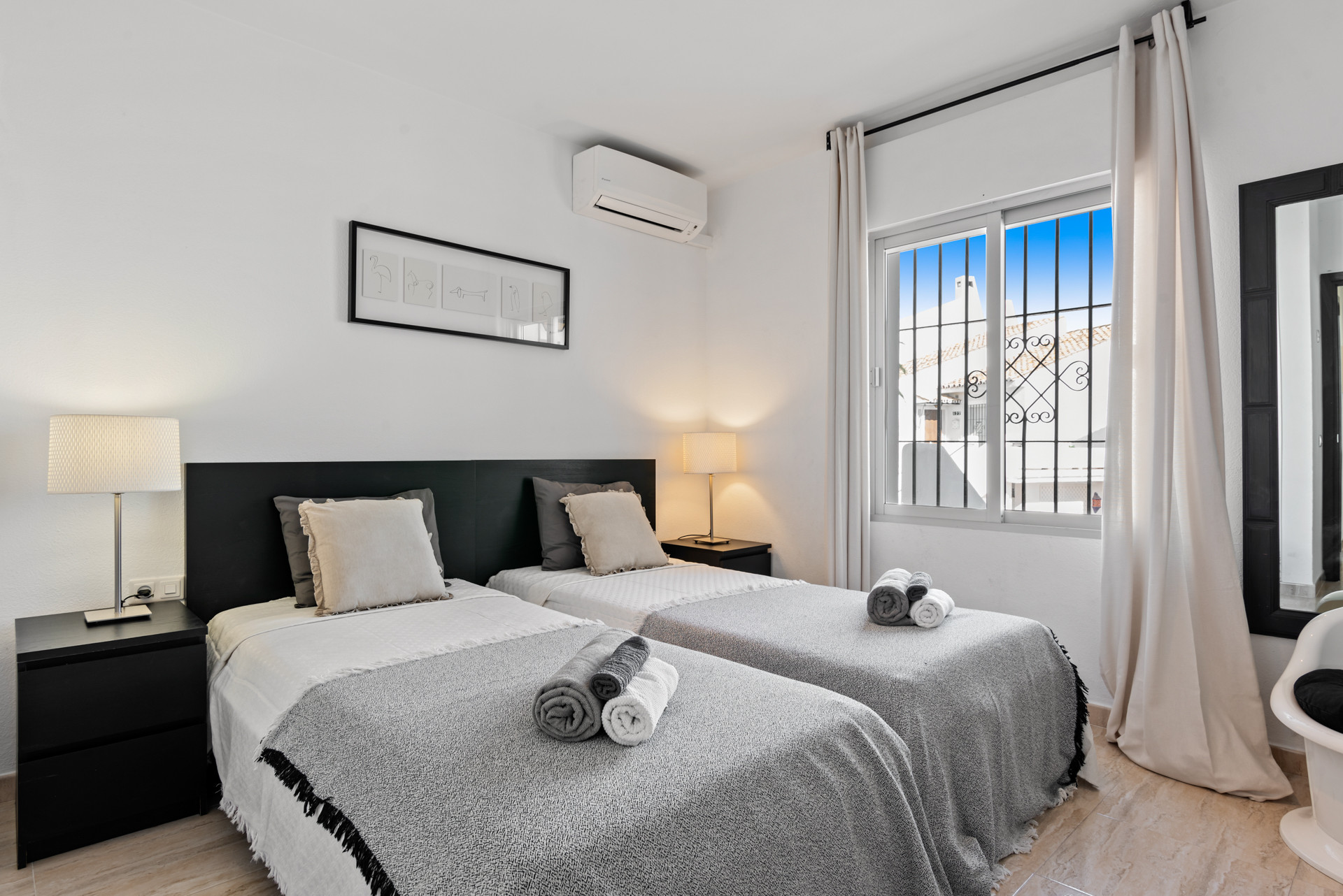 Välkommen till Casa Cielo! Casa Cielo är en vackert presenterad 2-rumslägenhet med 1 badrum i Aldea Blanca, som erbjuder modern komfort i ett av Nueva Andalucías mest eftertraktade inhägnade bostadsområden. Lägenheten har en ljus öppen planlösning där vardagsrum, matplats och kök flyter sömlöst samman och skapar en rymlig och social miljö fylld av naturligt ljus. Stora skjutbara glasdörrar förbinder interiören direkt med terrassen och förstärker den luftiga känslan överallt. Ett av sovrummen smälter obemärkt in i vardagsrummet och skapar ett flexibelt utrymme som kan fungera som ett extra loungerum eller gästområde, samtidigt som lägenhetens öppna, moderna estetik bibehålls. Varma trägolv och neutrala toner ger hemmet en lugn, modern atmosfär.