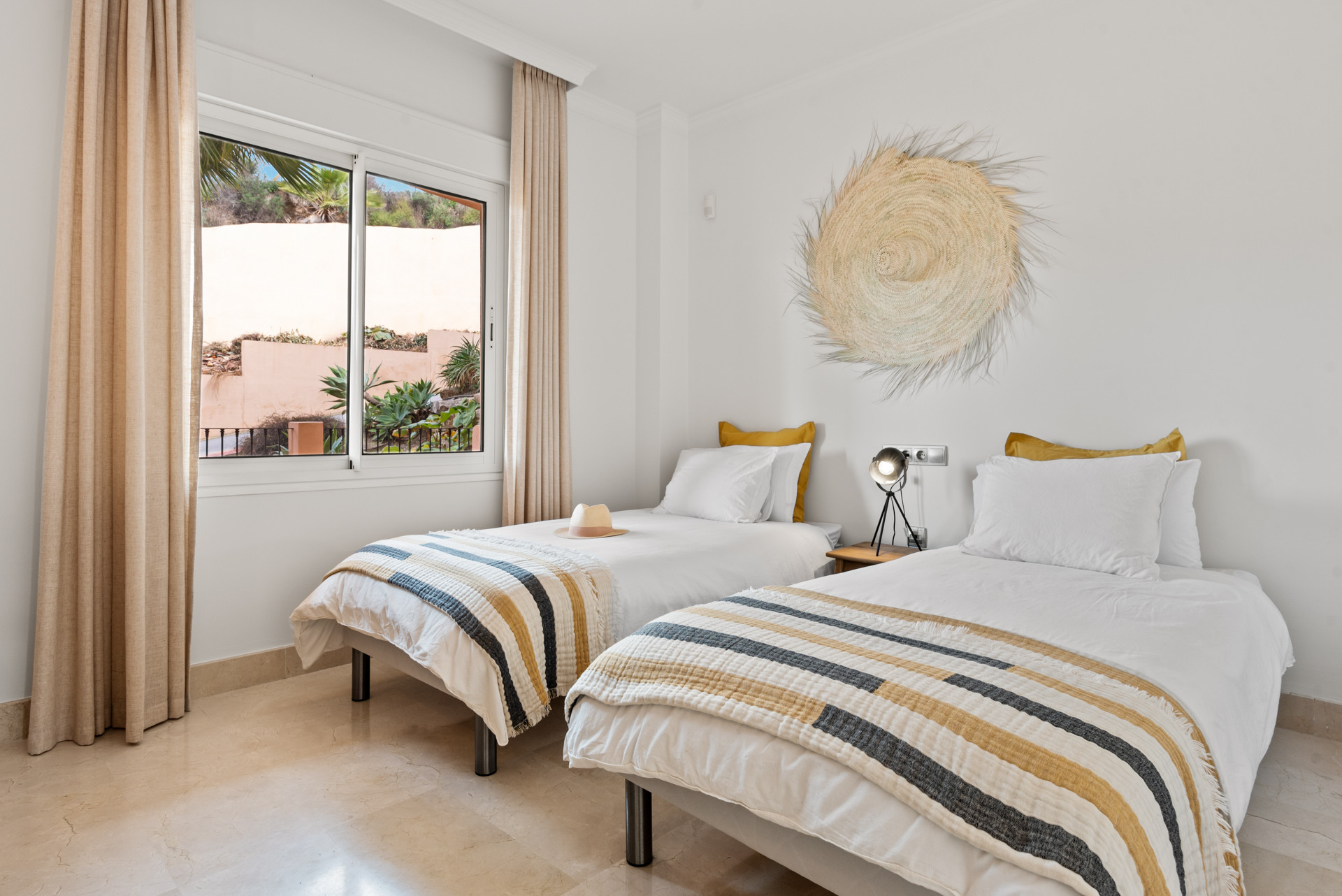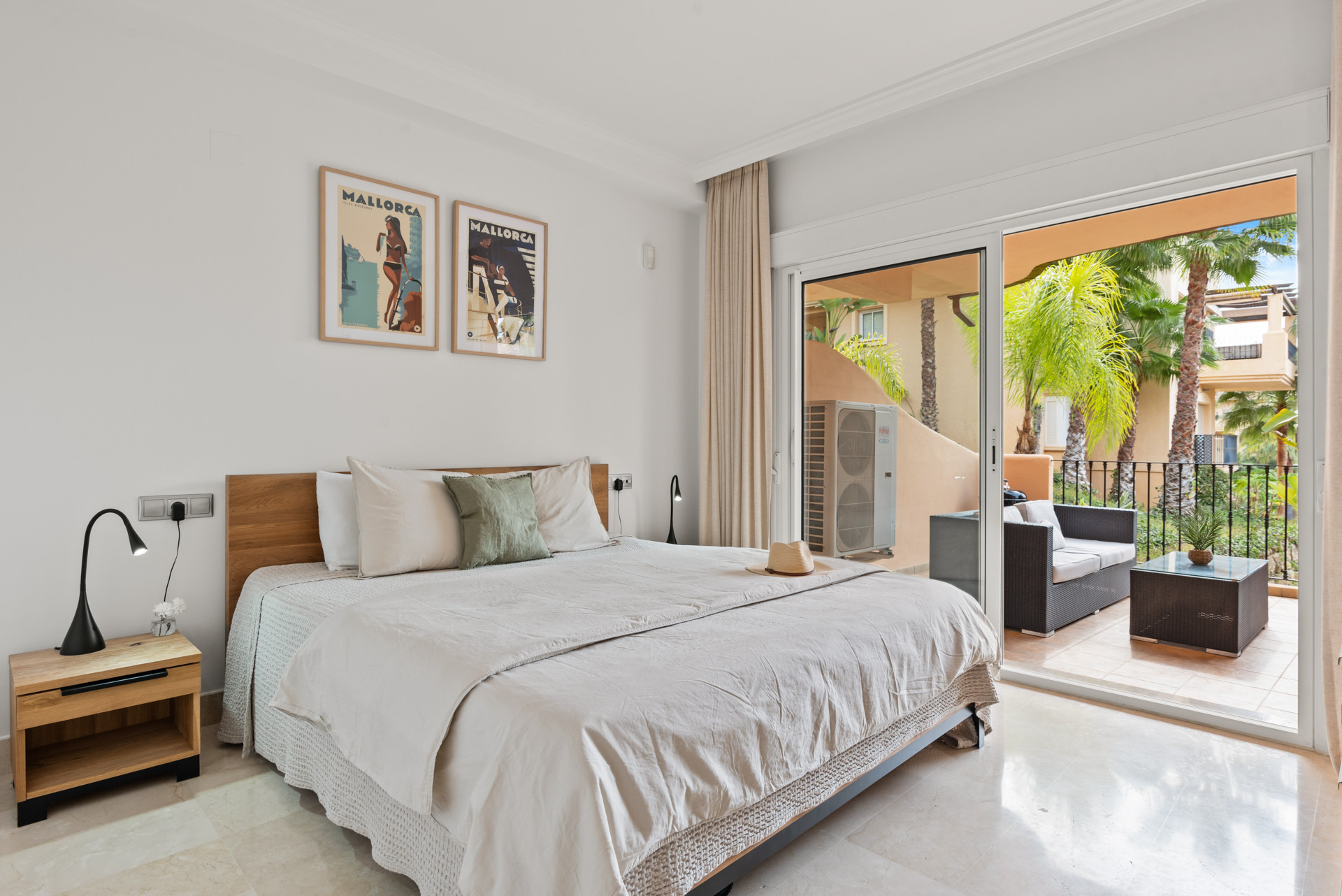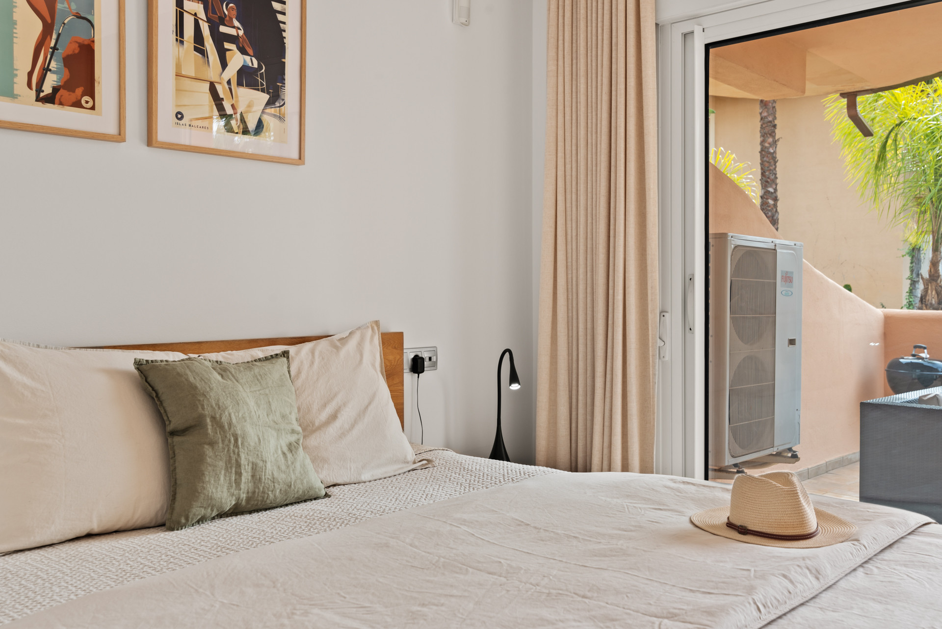 Välkommen till Casa Cielo! Casa Cielo är en vackert presenterad 2-rumslägenhet med 1 badrum i Aldea Blanca, som erbjuder modern komfort i ett av Nueva Andalucías mest eftertraktade inhägnade bostadsområden. Lägenheten har en ljus öppen planlösning där vardagsrum, matplats och kök flyter sömlöst samman och skapar en rymlig och social miljö fylld av naturligt ljus. Stora skjutbara glasdörrar förbinder interiören direkt med terrassen och förstärker den luftiga känslan överallt. Ett av sovrummen smälter obemärkt in i vardagsrummet och skapar ett flexibelt utrymme som kan fungera som ett extra loungerum eller gästområde, samtidigt som lägenhetens öppna, moderna estetik bibehålls. Varma trägolv och neutrala toner ger hemmet en lugn, modern atmosfär.
