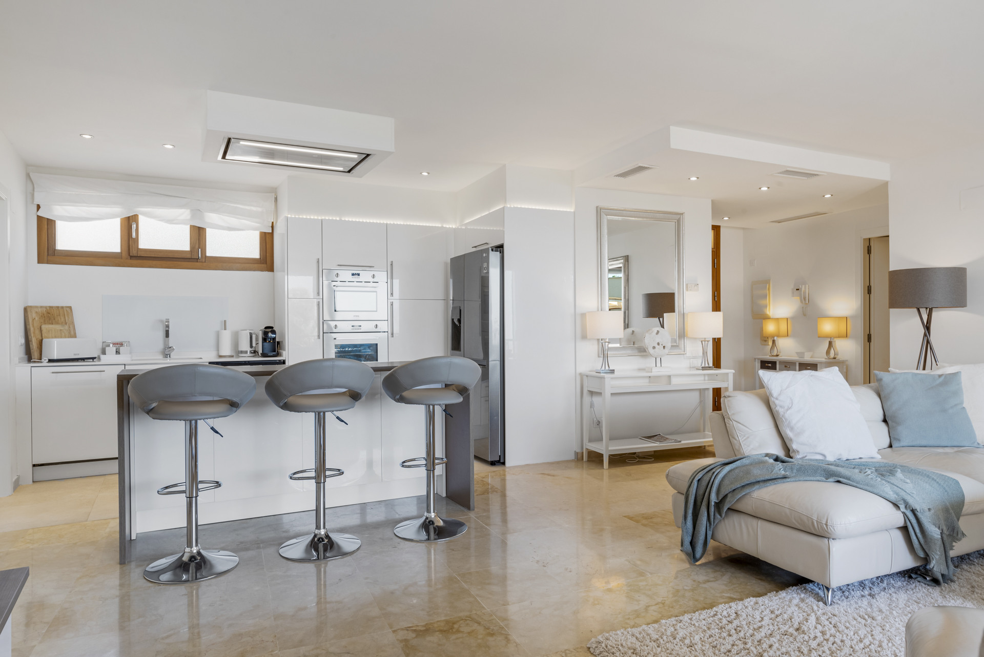 Köket och vardagsrummet med öppen planlösning är hjärtat i hemmet, designat för avslappnat, modernt boende. Det flyter enkelt in i loungen och ut på en stor terrass med en matplats utomhus och grill, där långa eftermiddagar och utomhusmiddagar kommer med en vidsträckt havsutsikt. Oavsett om du är värd eller varva ner, erbjuder detta utrymme den perfekta balansen mellan stil och komfort.