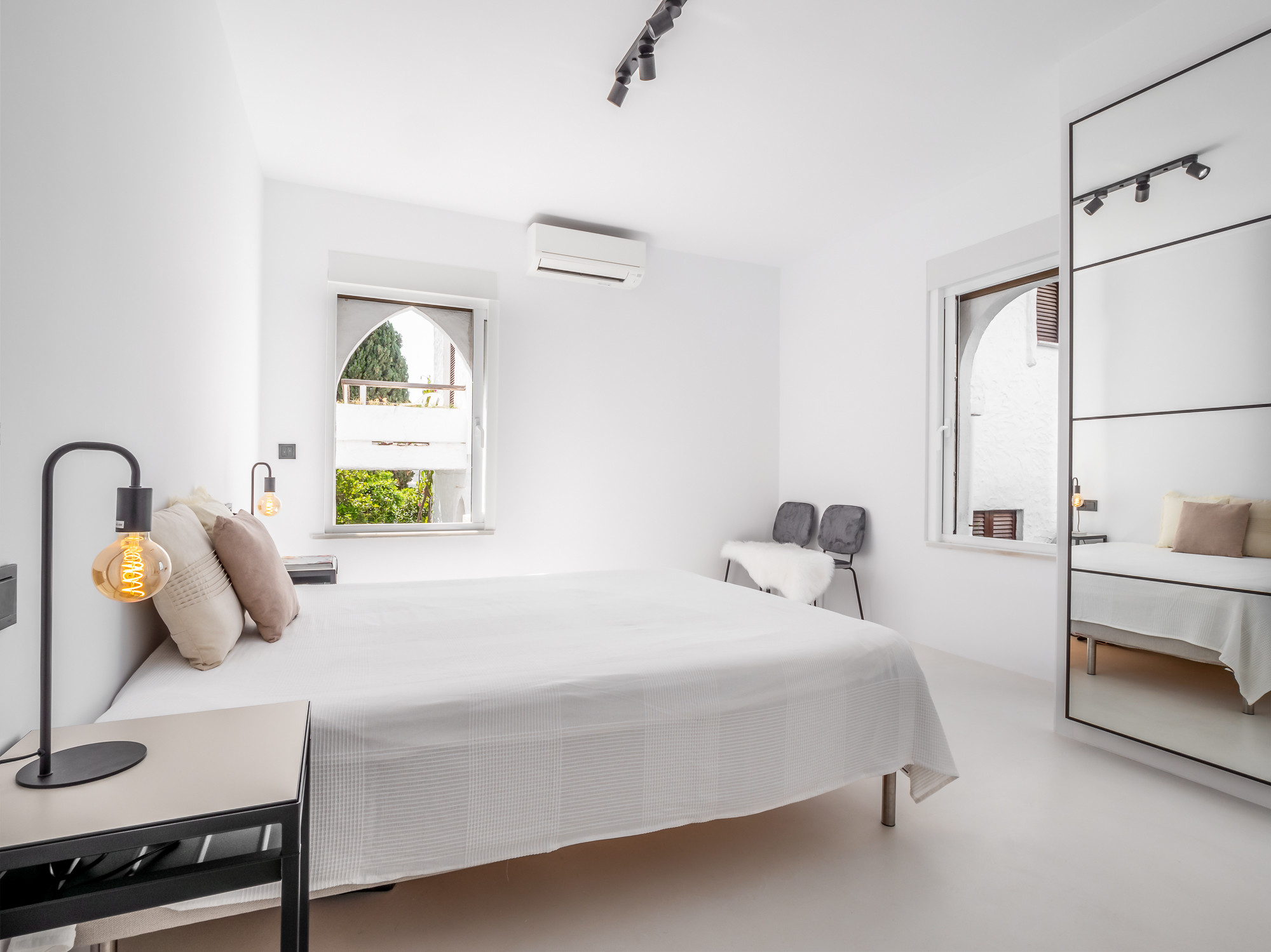 Välkommen till Casa Cielo! Casa Cielo är en vackert presenterad 2-rumslägenhet med 1 badrum i Aldea Blanca, som erbjuder modern komfort i ett av Nueva Andalucías mest eftertraktade inhägnade bostadsområden. Lägenheten har en ljus öppen planlösning där vardagsrum, matplats och kök flyter sömlöst samman och skapar en rymlig och social miljö fylld av naturligt ljus. Stora skjutbara glasdörrar förbinder interiören direkt med terrassen och förstärker den luftiga känslan överallt. Ett av sovrummen smälter obemärkt in i vardagsrummet och skapar ett flexibelt utrymme som kan fungera som ett extra loungerum eller gästområde, samtidigt som lägenhetens öppna, moderna estetik bibehålls. Varma trägolv och neutrala toner ger hemmet en lugn, modern atmosfär.